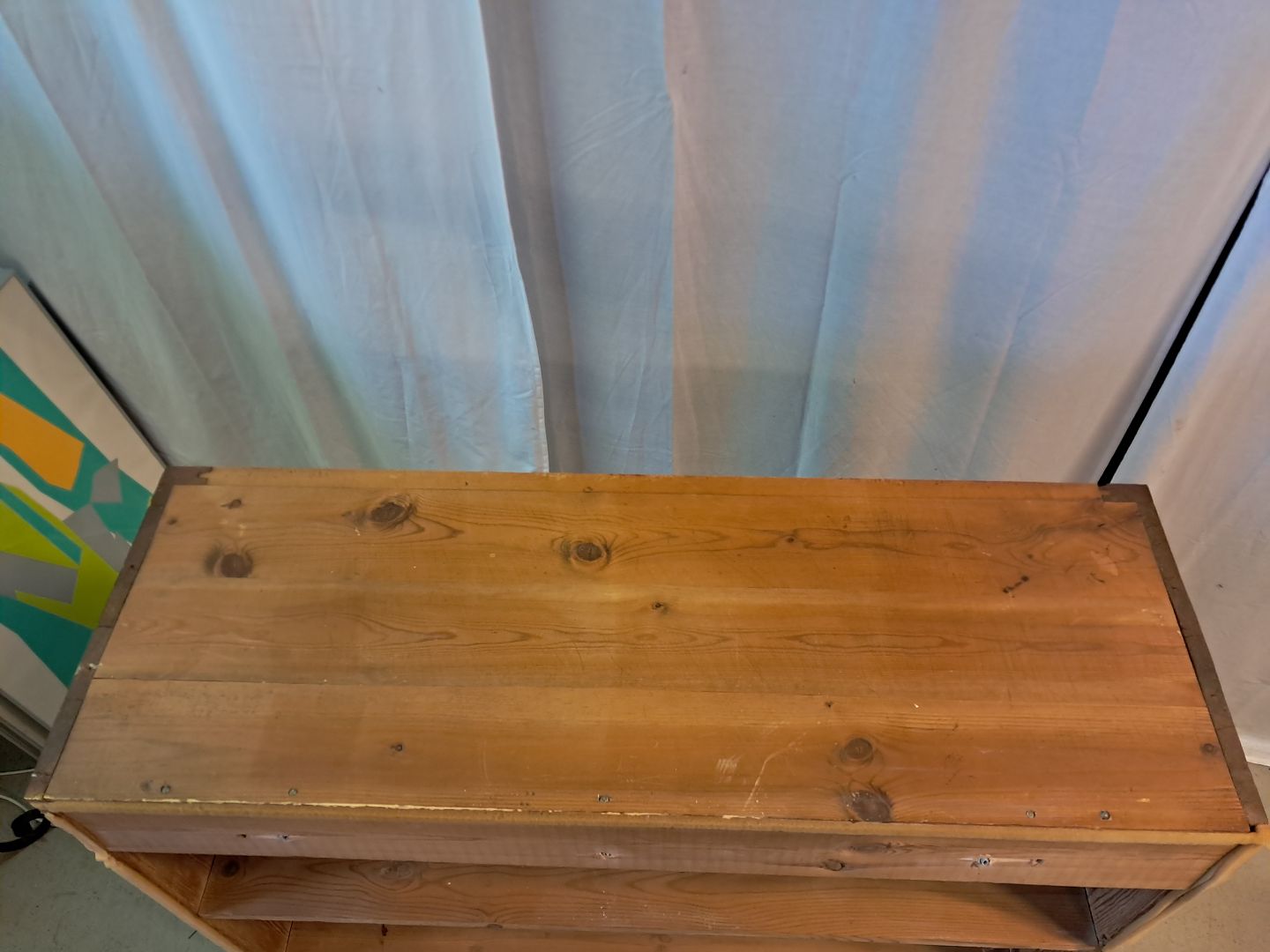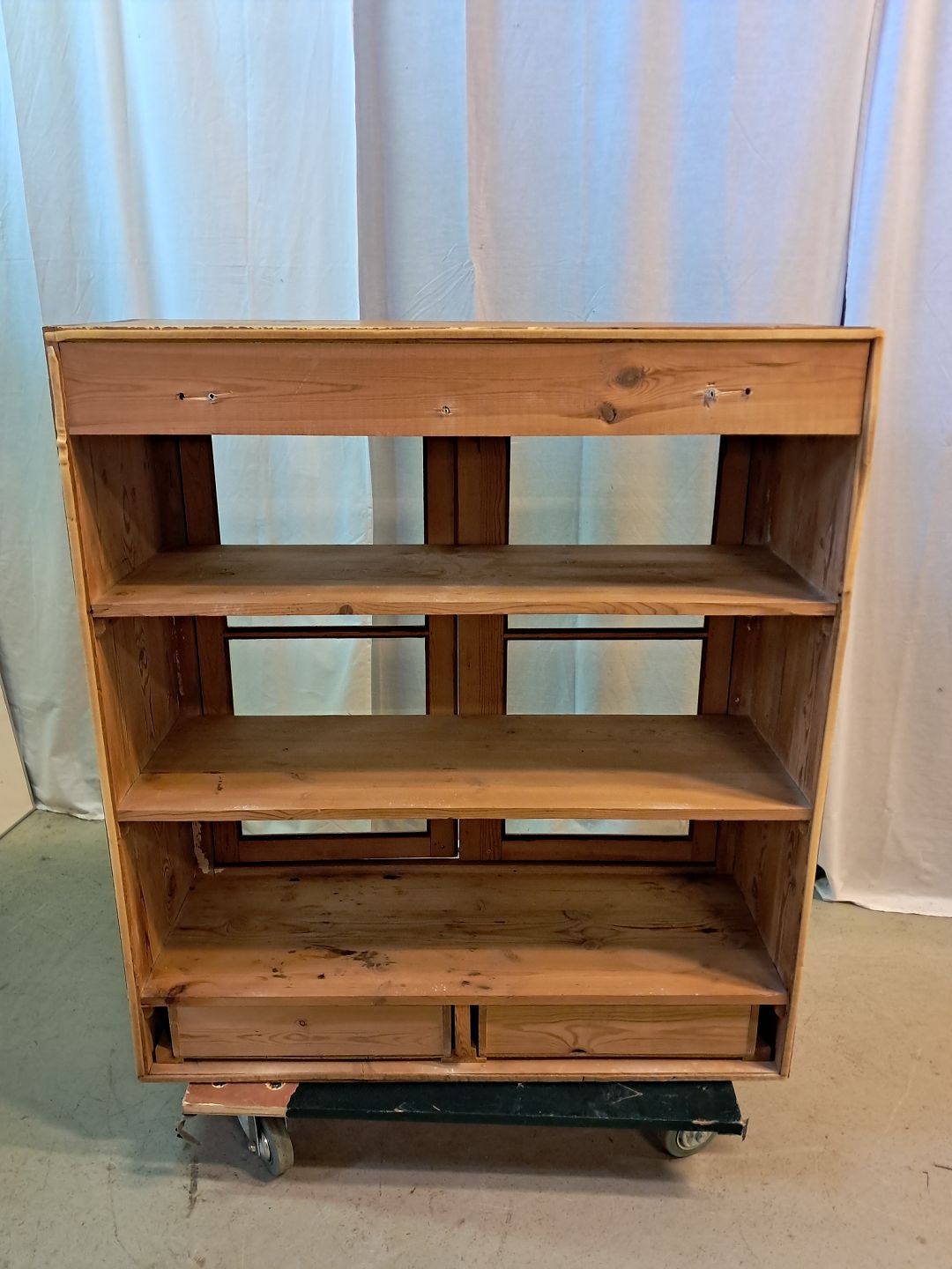 Gammelt køkkenskab i massivt fyrretræ, fra 1920erne.Det har brugsspor.