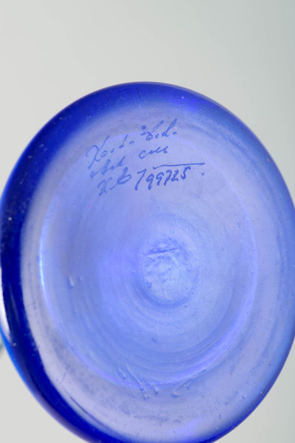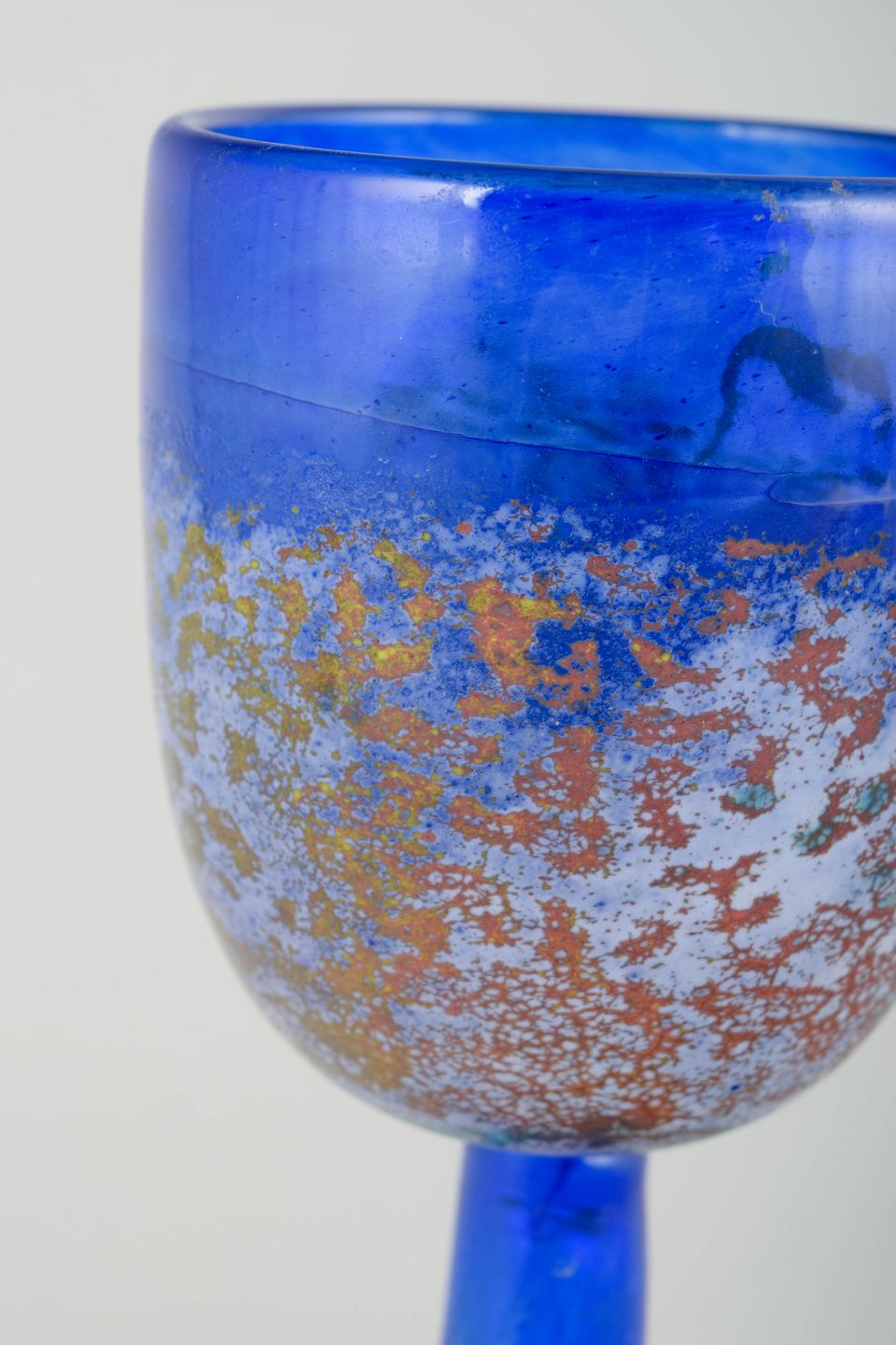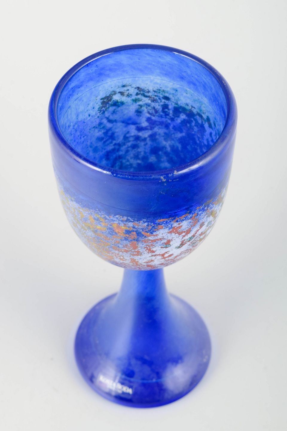 Kunstnerisk udført vinglas i blåt glas med metallisk iriserende dekoration i bronze og sølvtoner. Et karakteristisk eksempel på Engmans eksperimenterende arbejde med farve og tekstur hos Kosta Boda.