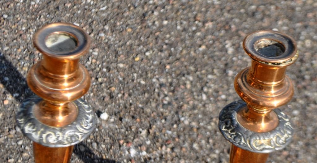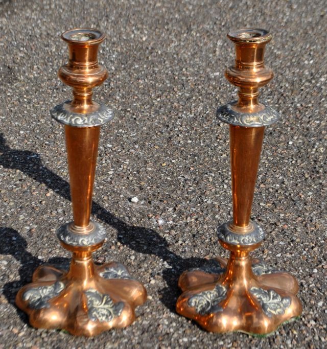 Et par engelske kobberstager med tin, 19. årh. H.: 30,5cm.Emne nummer: 28345
