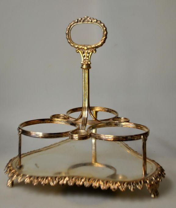 Engelsk forsølvet vinholder, 20. årh. Trekantet form til tre flasker med holder. H.. 26 cm. B.: 25 cm.Emne nummer: 28346