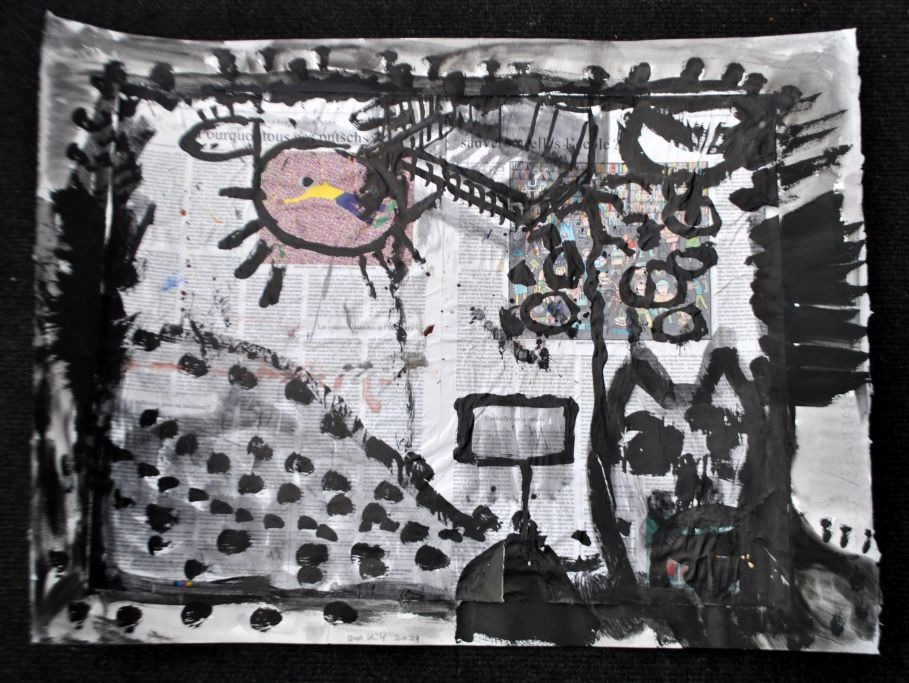 Kühl, Lena (1950 -) Danmark: Komposition, 2024. Collage med avisudklip og tusch. Signeret: Lena Kühl 2024. H: 56 cm. B: 76 cm.Uindrammet.