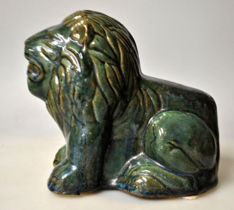 Keramisk løve, Kina. 19. årh. Medgrøn/blålig glasur. H: 19 cm.Emne nummer: 28479