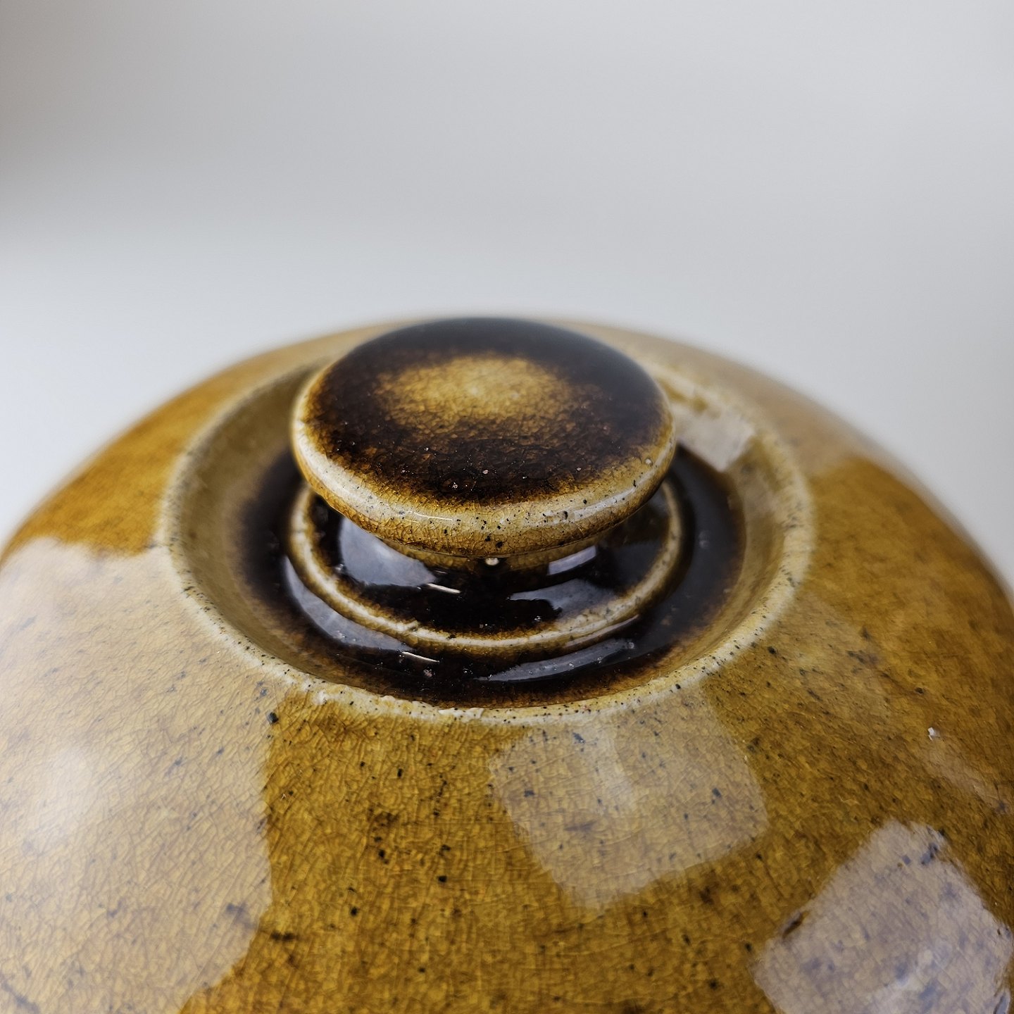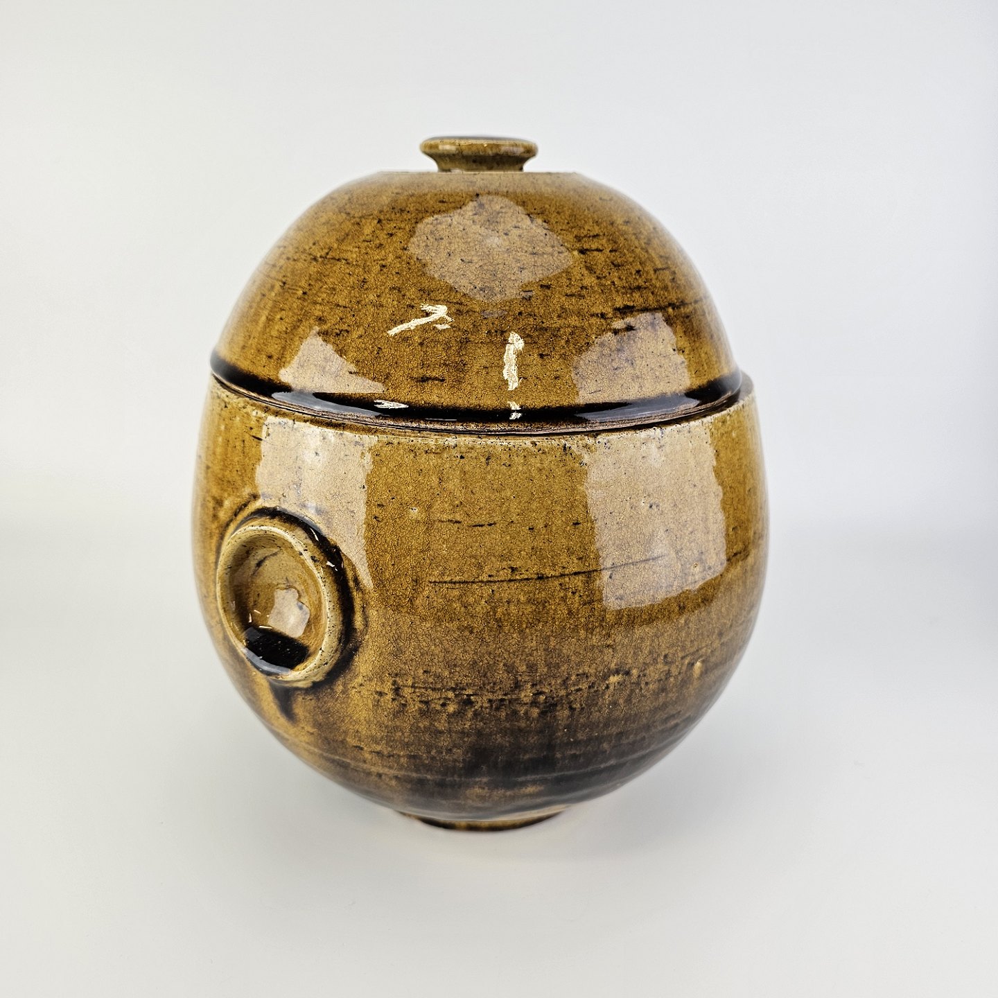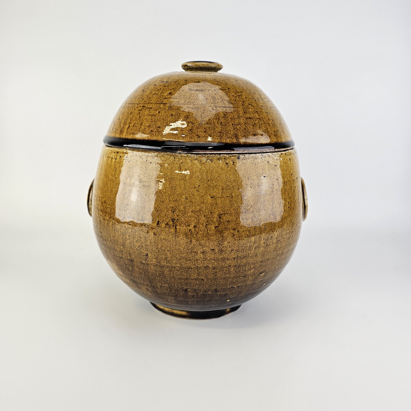 Æggeformet krukke med låg i brun glaseret keramikProducent Herman Kähler