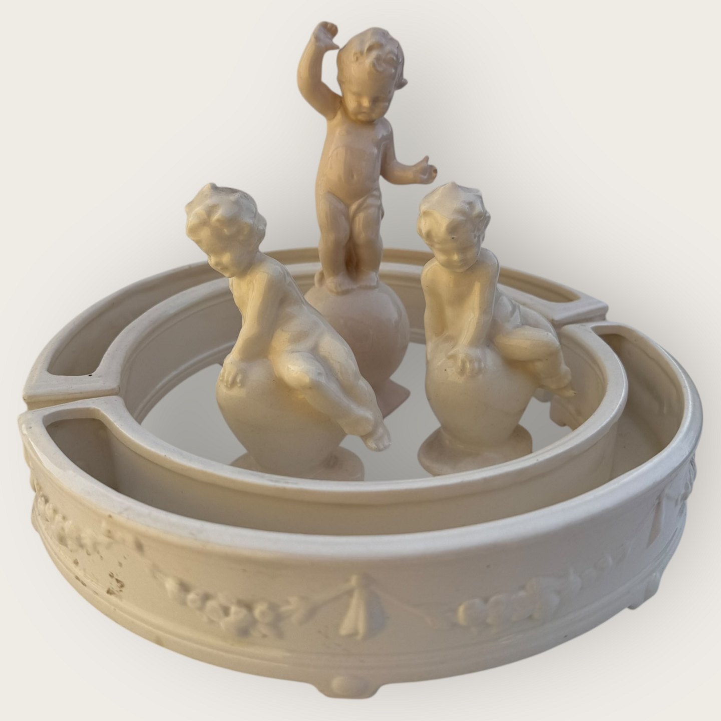 Tischdekoration, Fayence-Tischbild mit Figuren, cremeweiße Fayence, *Guter gebrauchter Zustand, mit einigen sehr kleinen Abplatzungen*Lager: 1