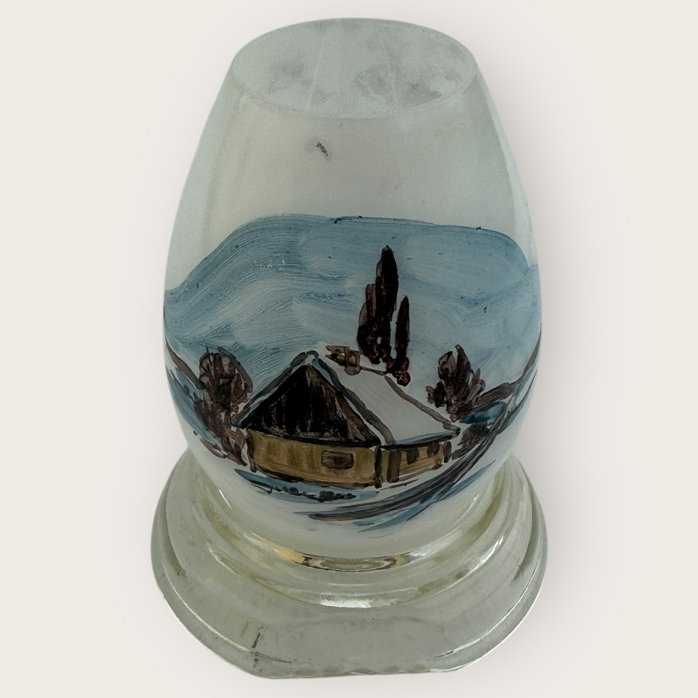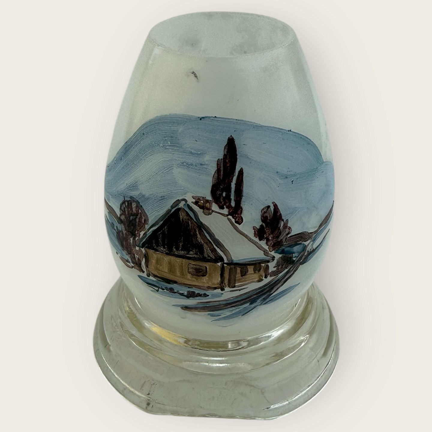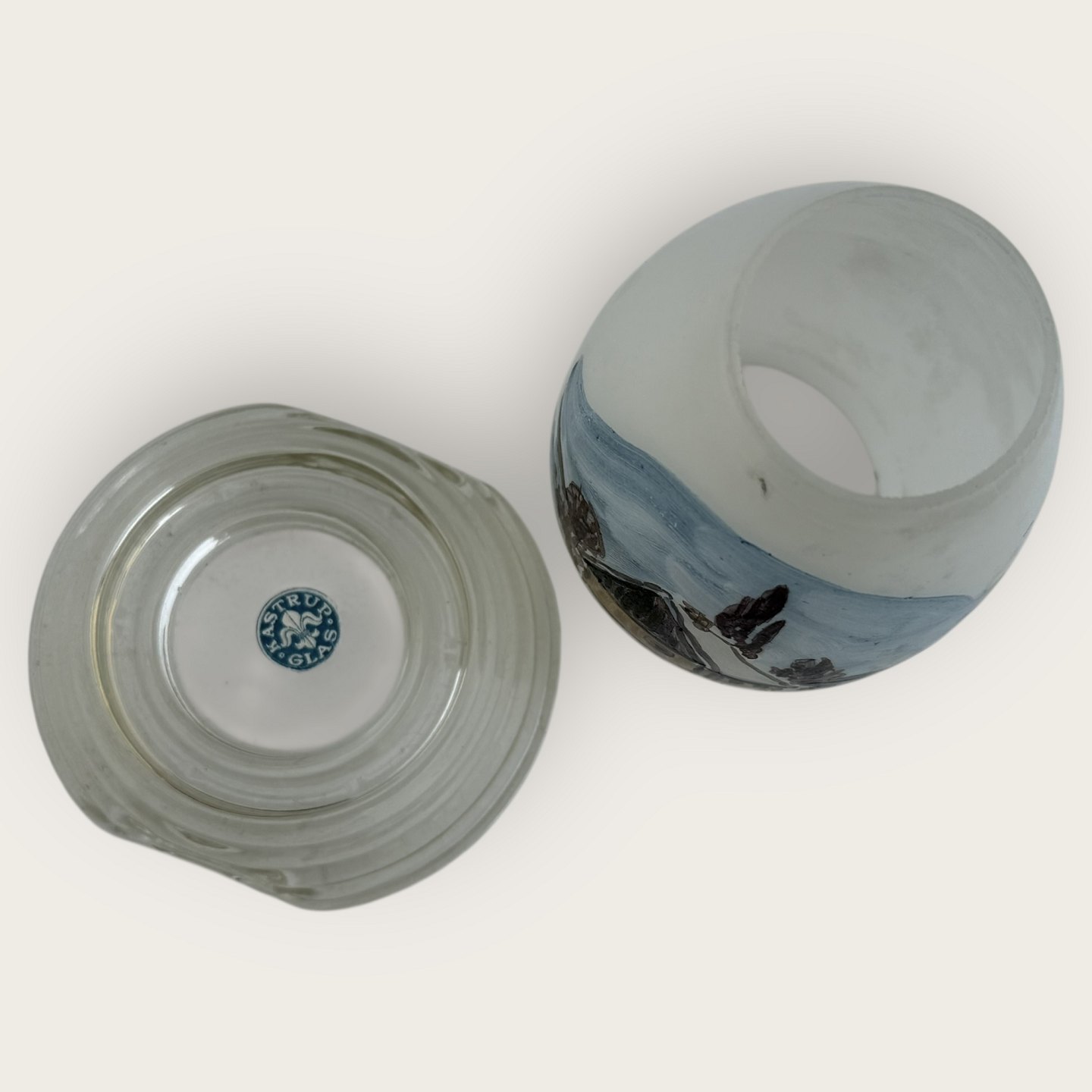 Kastrup Glasværk, hyggelampe med håndmalet dekoration til fyrfadslys, ca. 9cm høj *Et par mørke pletter i det øverste glas ellers fin stand *Lager: 1