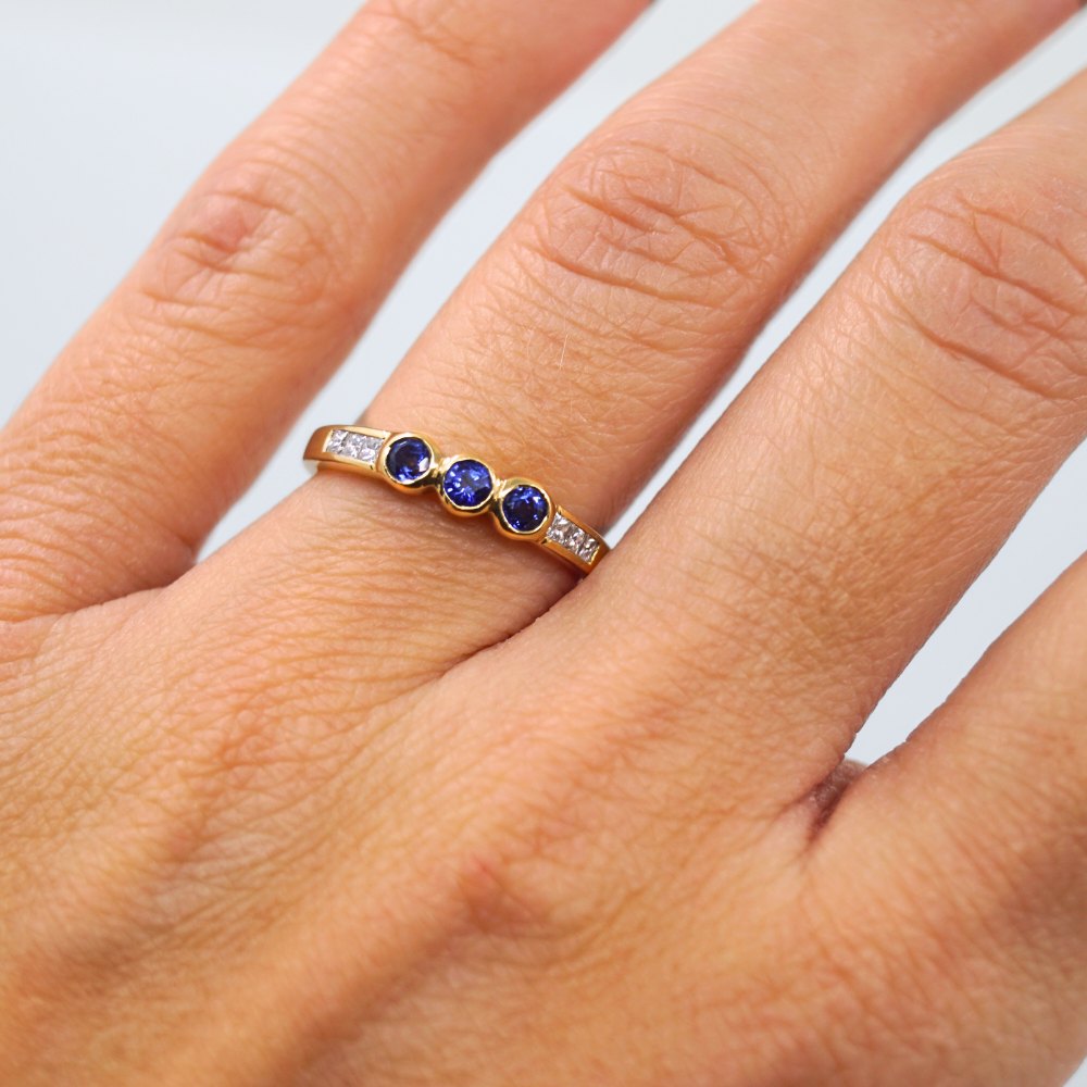 Ring i 18 kt. guld, prydet med tre safirer og seks diamanter, i alt 0.12 ct. Ring str. 50-51. Stemplet "750".Kontakt os gerne,