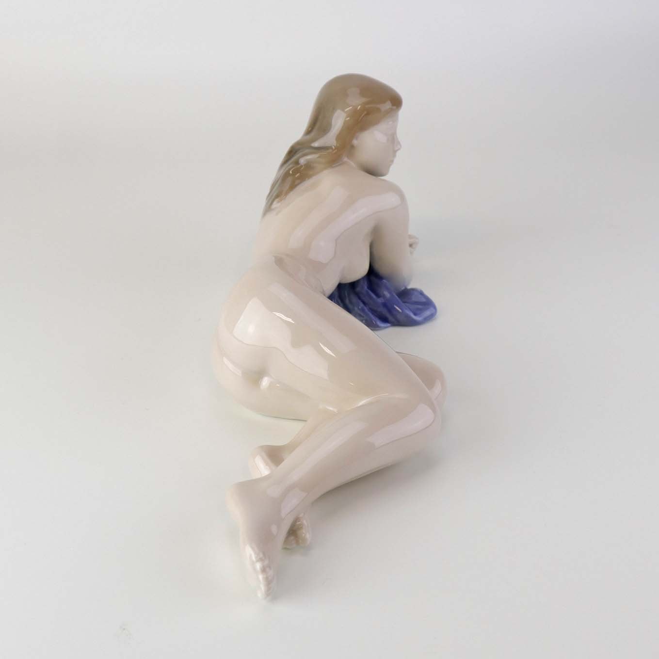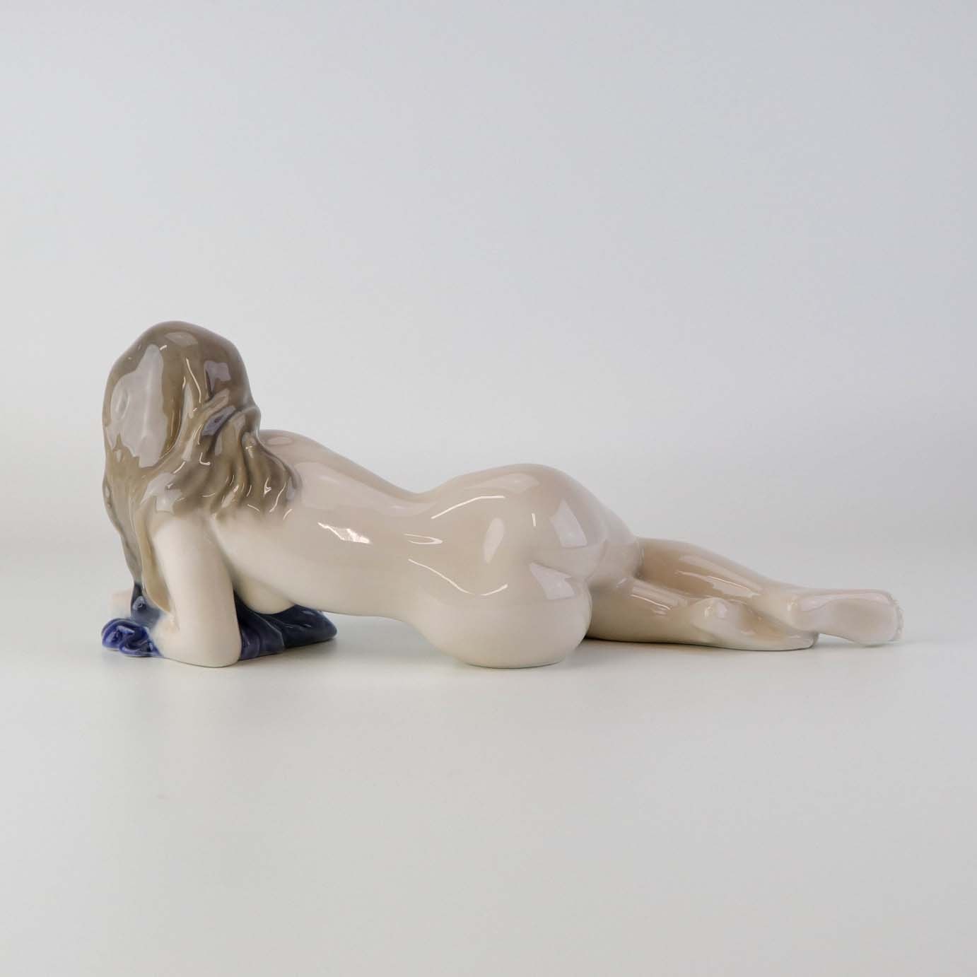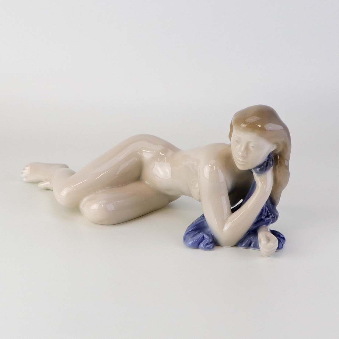 Figur i porcelæn med motiv af liggende nøgen kvinde med blåt klæde. Nr. 4703Formgiver John Galster