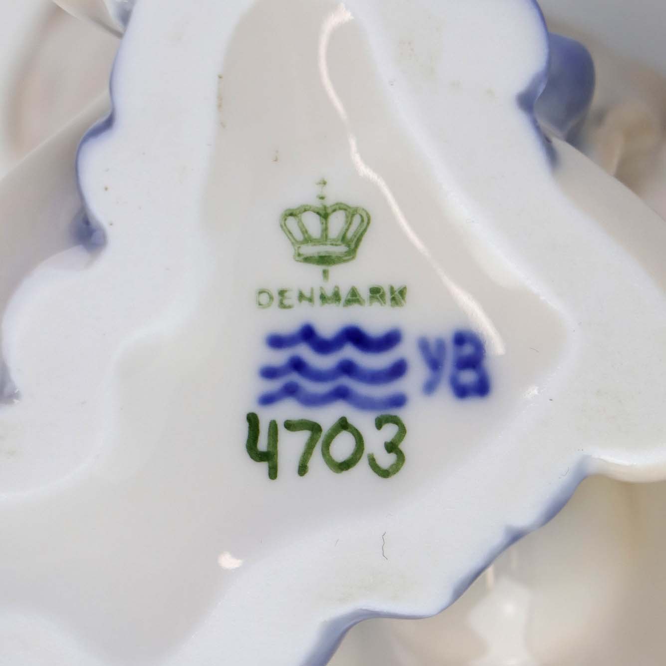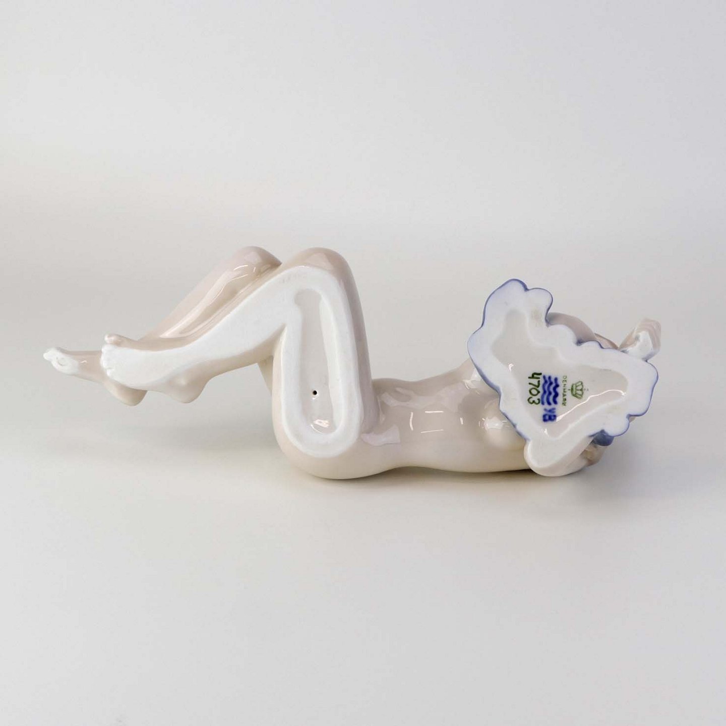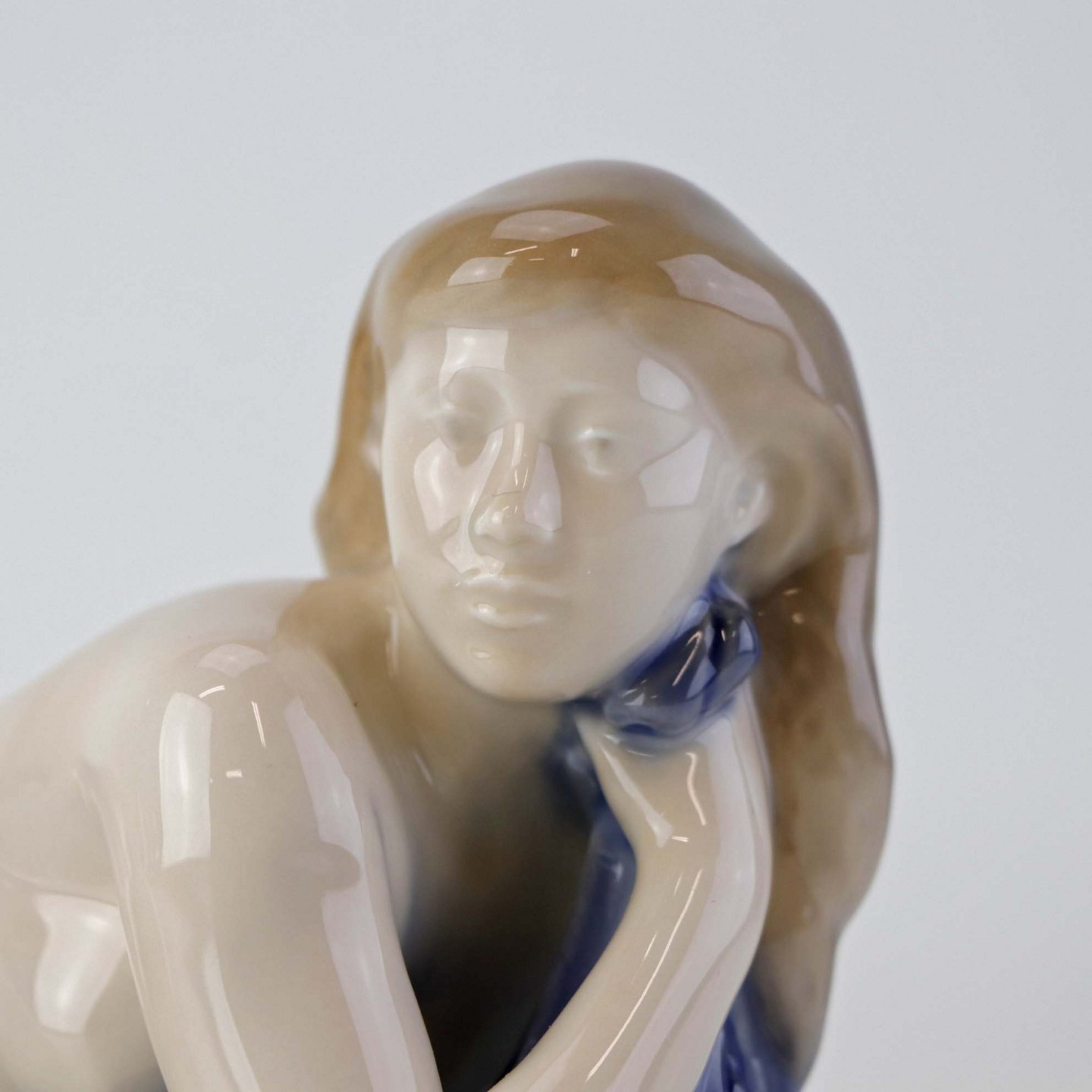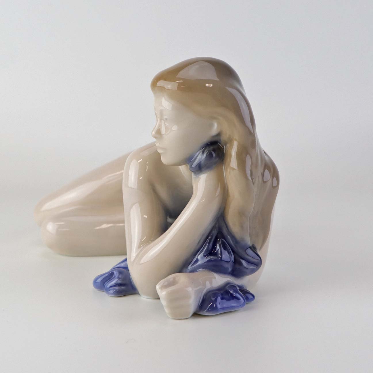 Figur i porcelæn med motiv af liggende nøgen kvinde med blåt klæde. Nr. 4703Formgiver John Galster