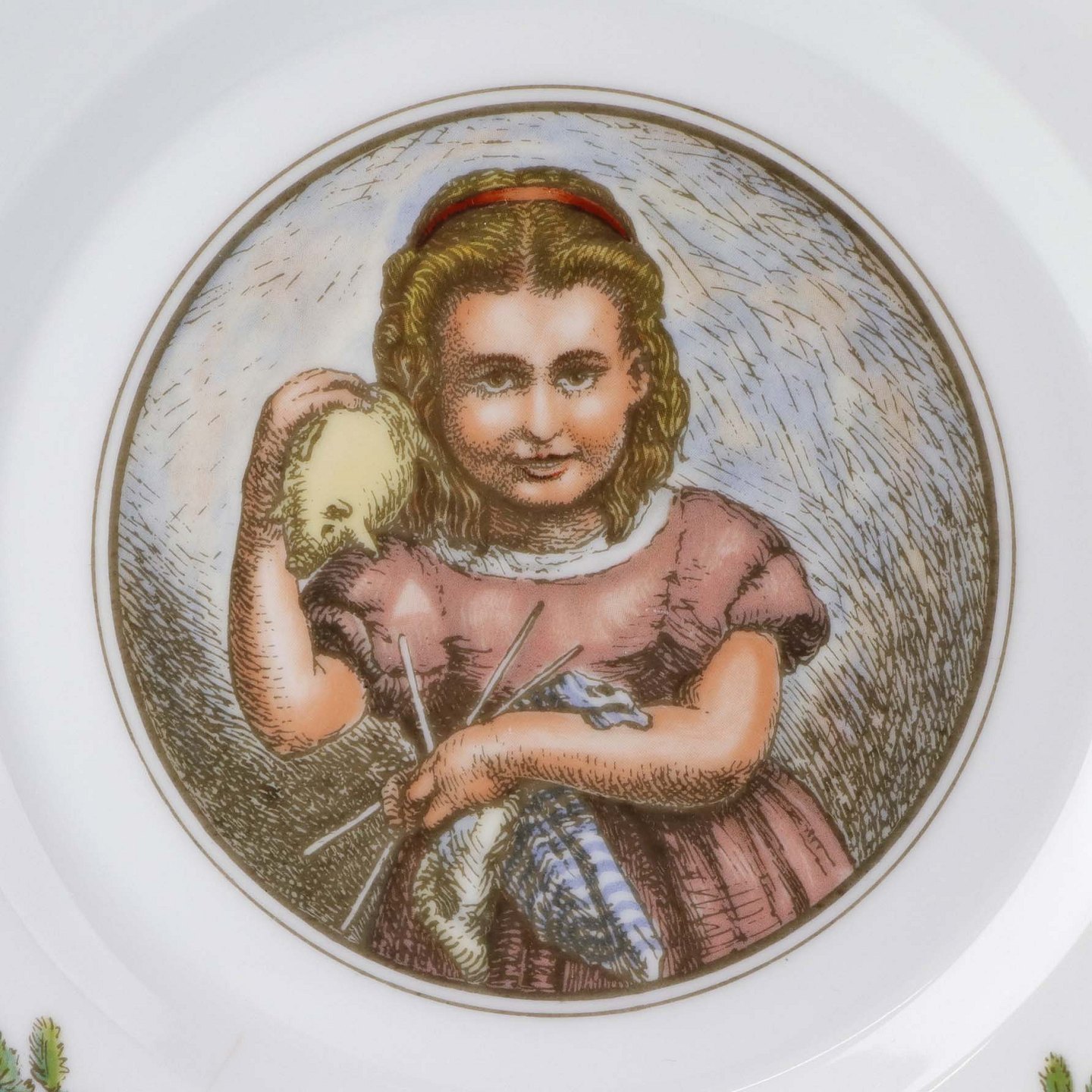 Flad desserttallerken i kongeligt porcelæn fra serien Peters Jul med motiv af søster Hanne. Nr. 3Formgiver Johan Krohn og Pietro Krohn