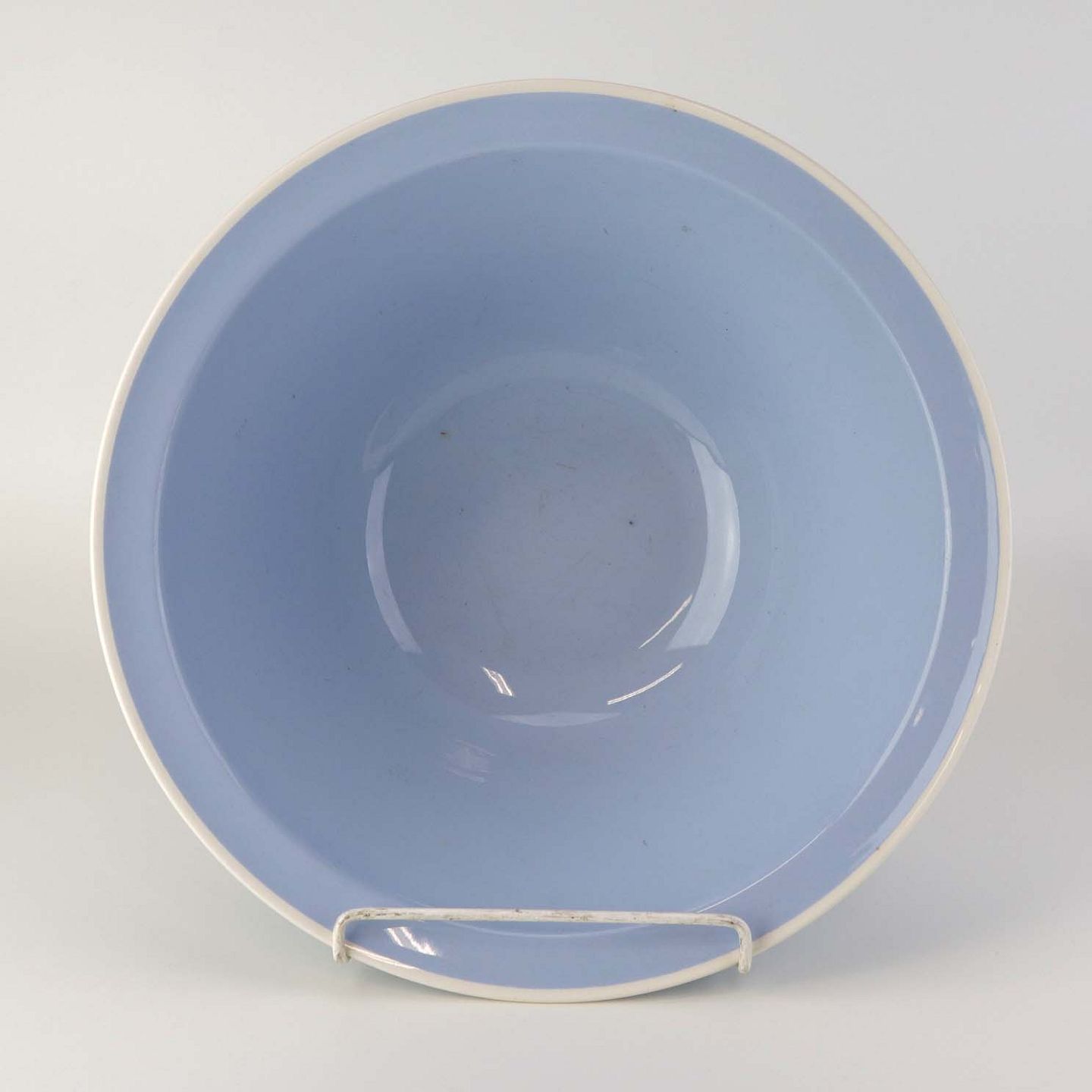Service i lyseblå fajance dekoreret med tynd hvid kant.
