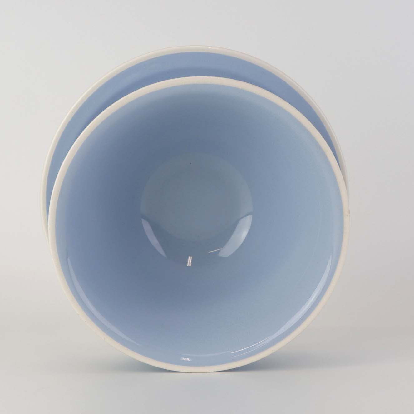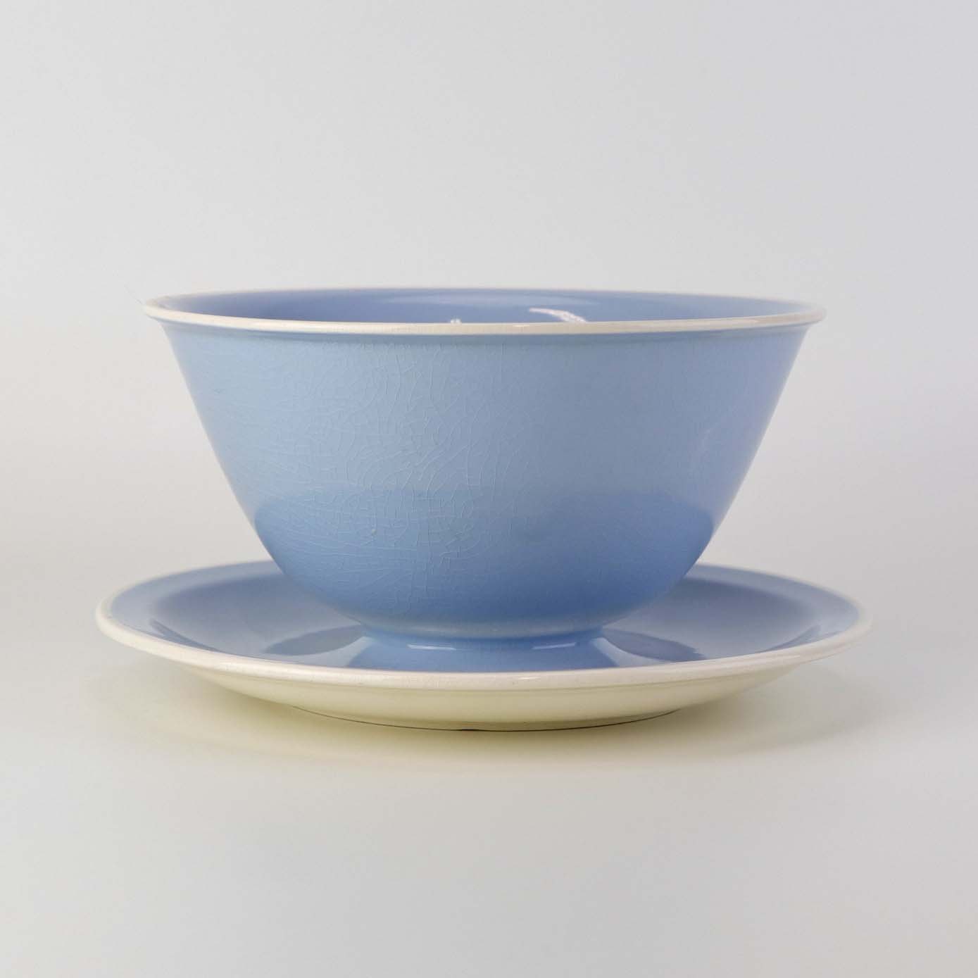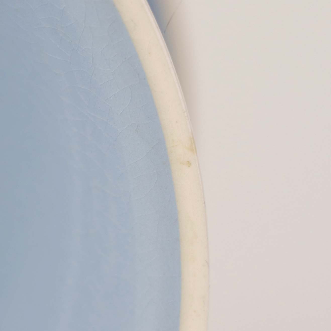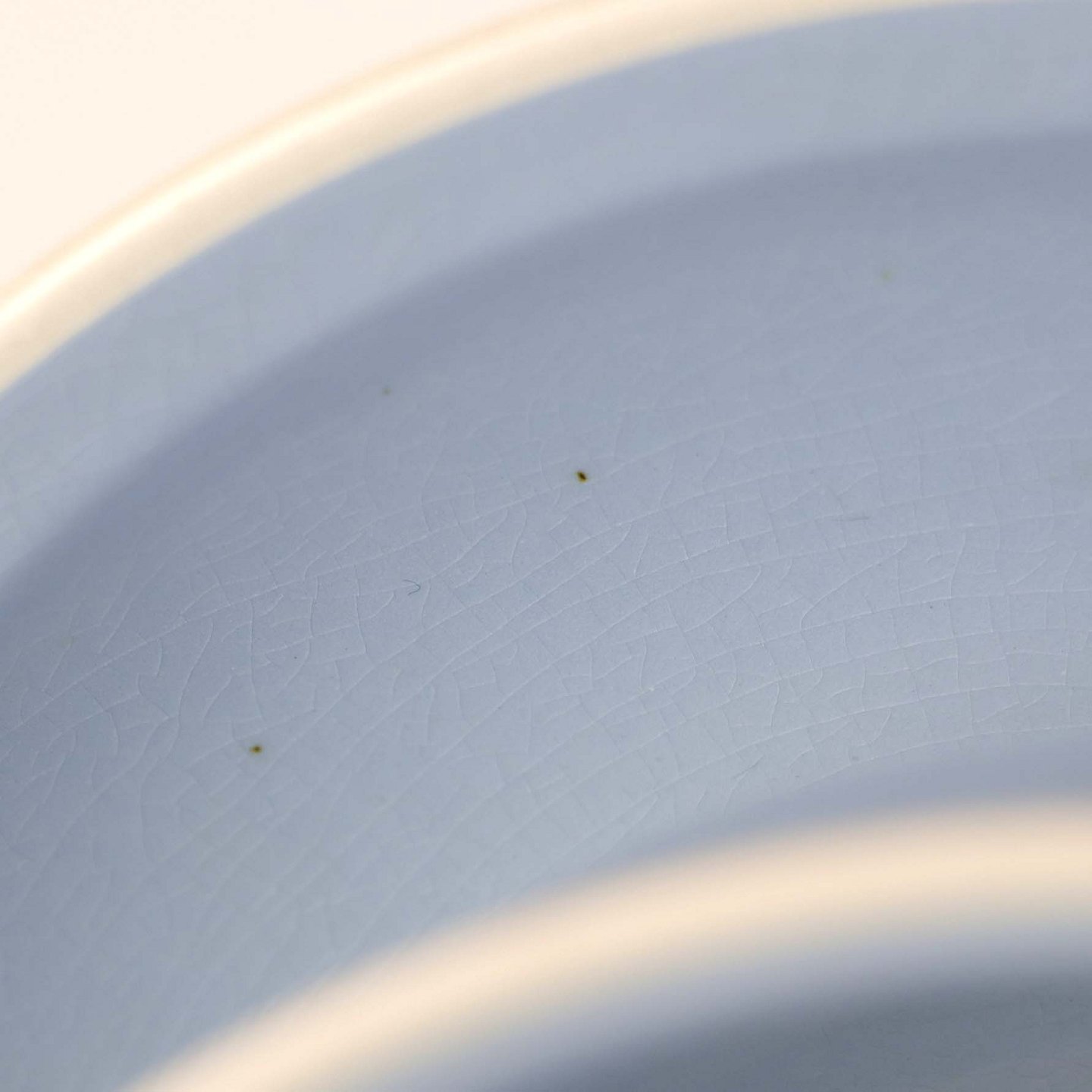 Service i lyseblå fajance dekoreret med tynd hvid kant.