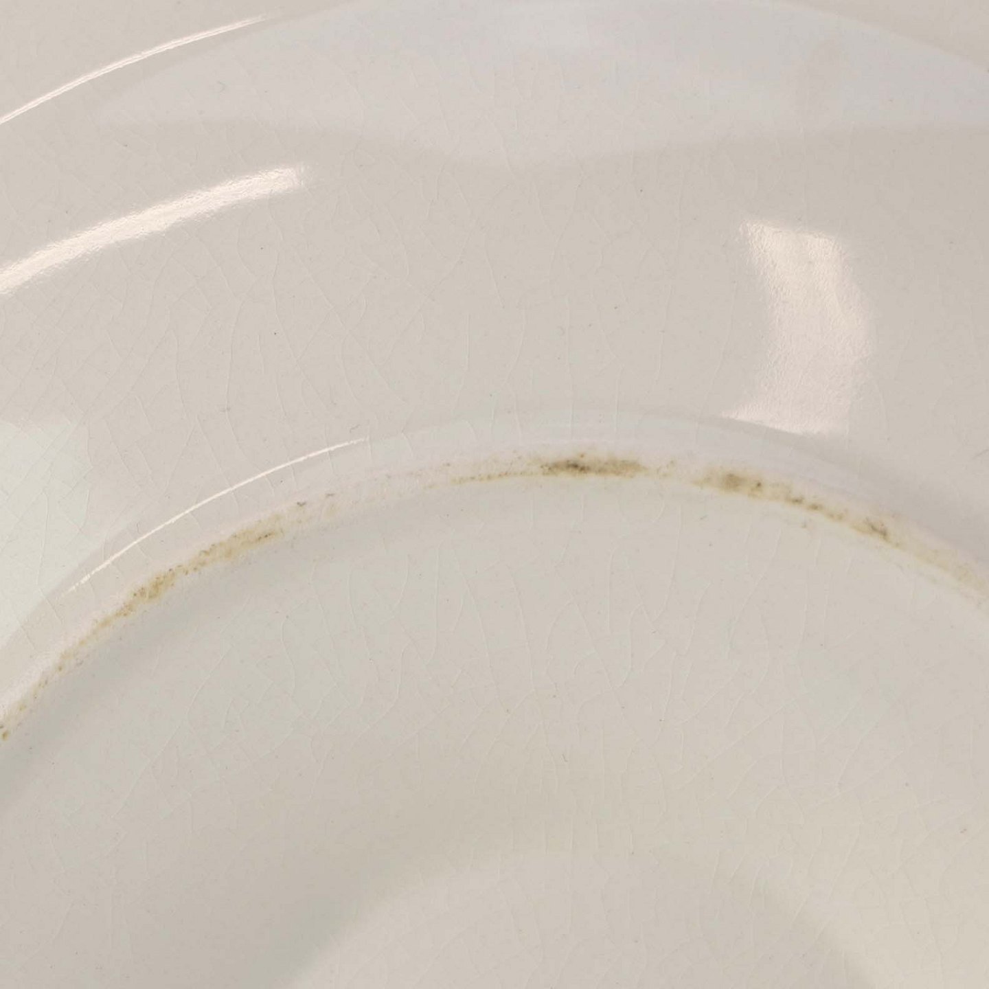 Fremstår med krakkeleringer i glasuren, enkelte sorte nister og en mindre bruning på topkanten.