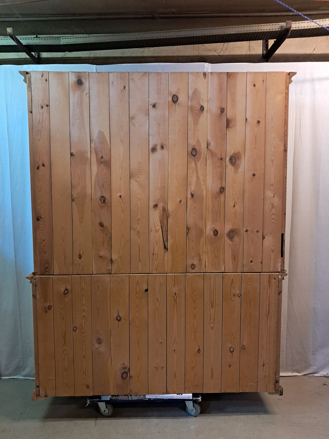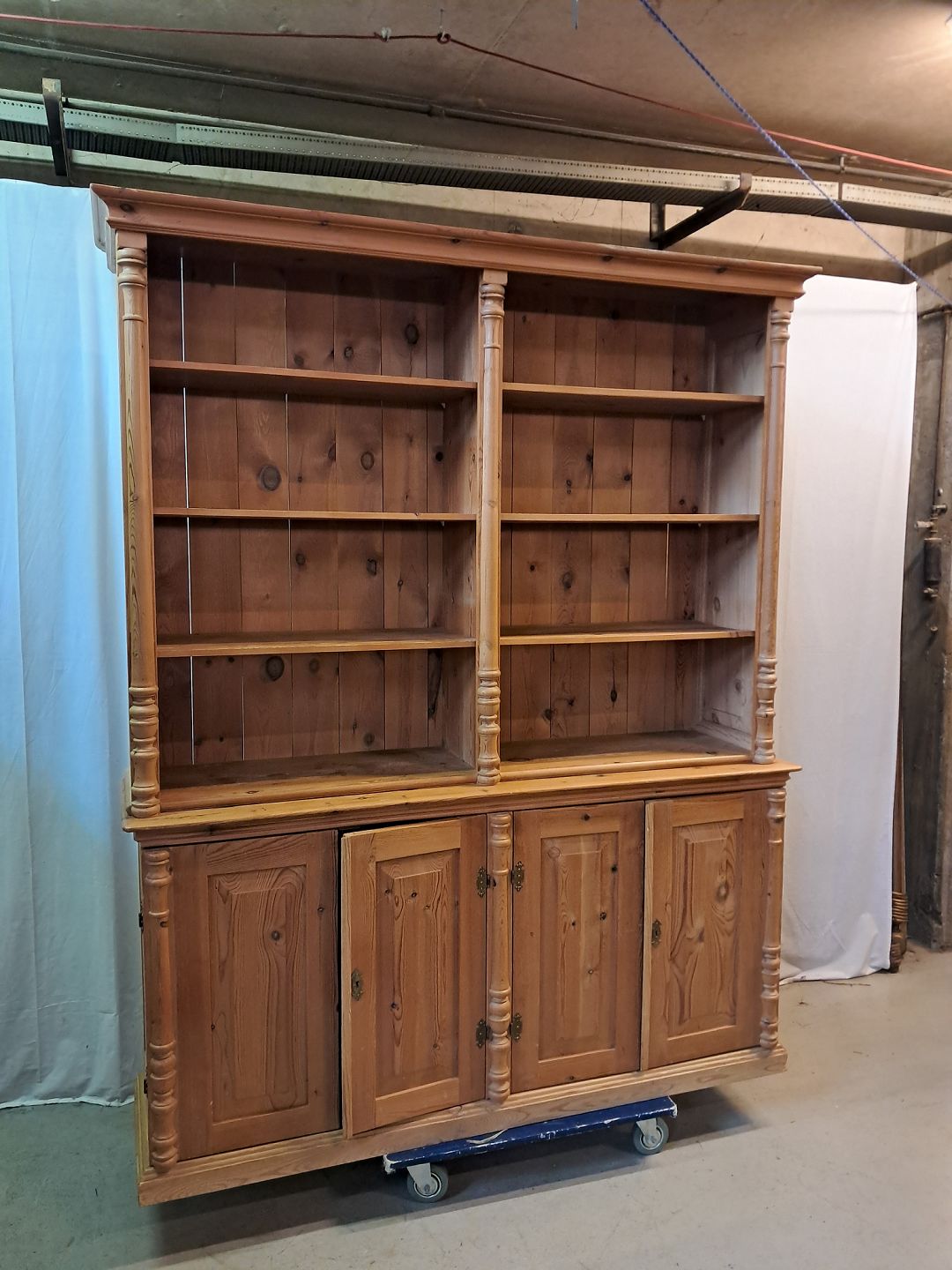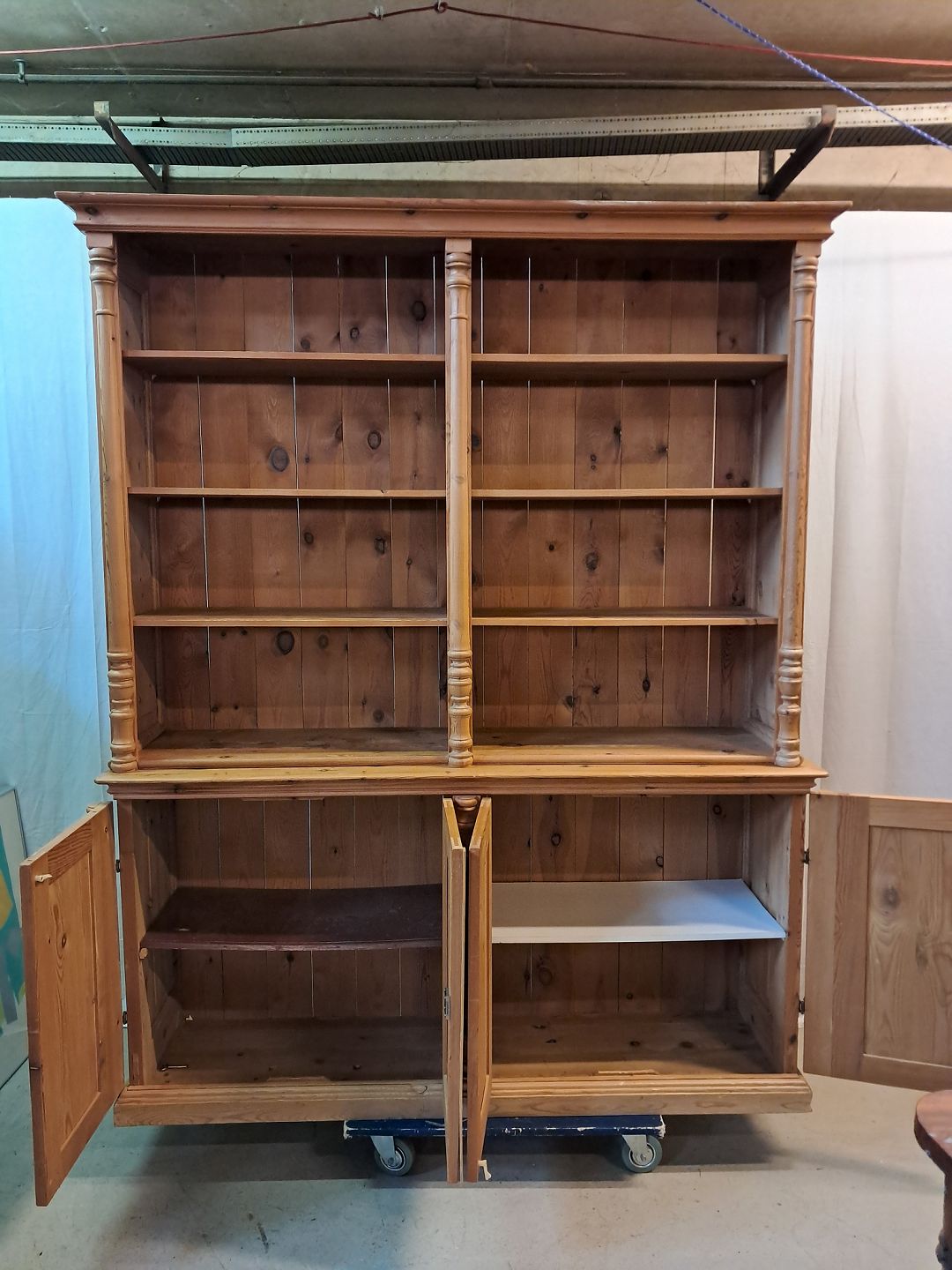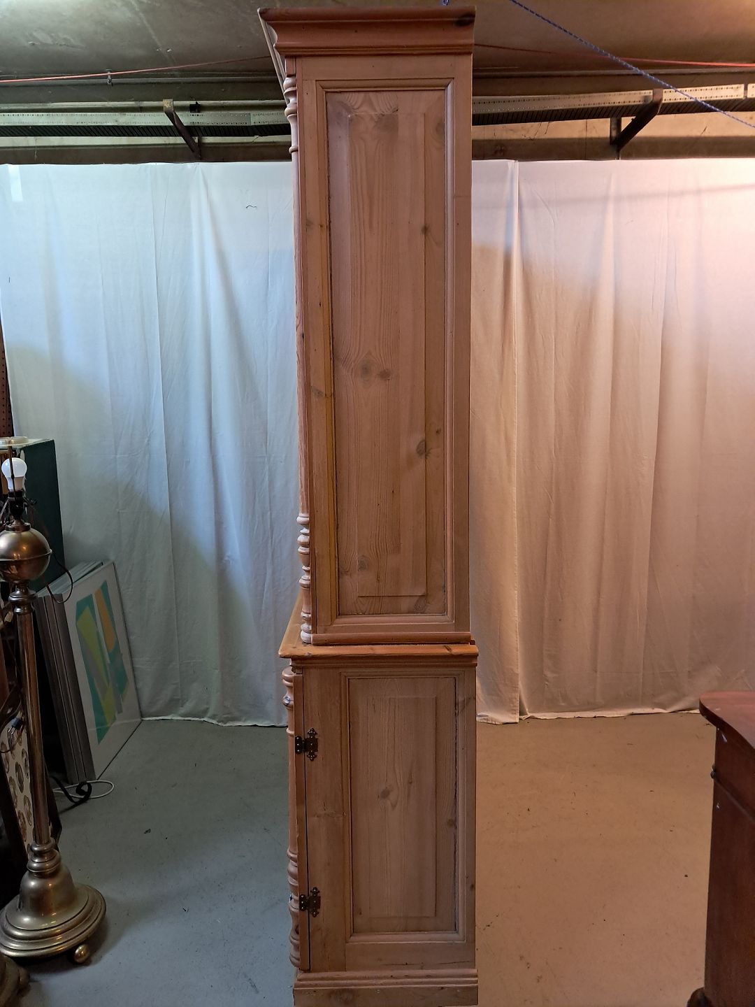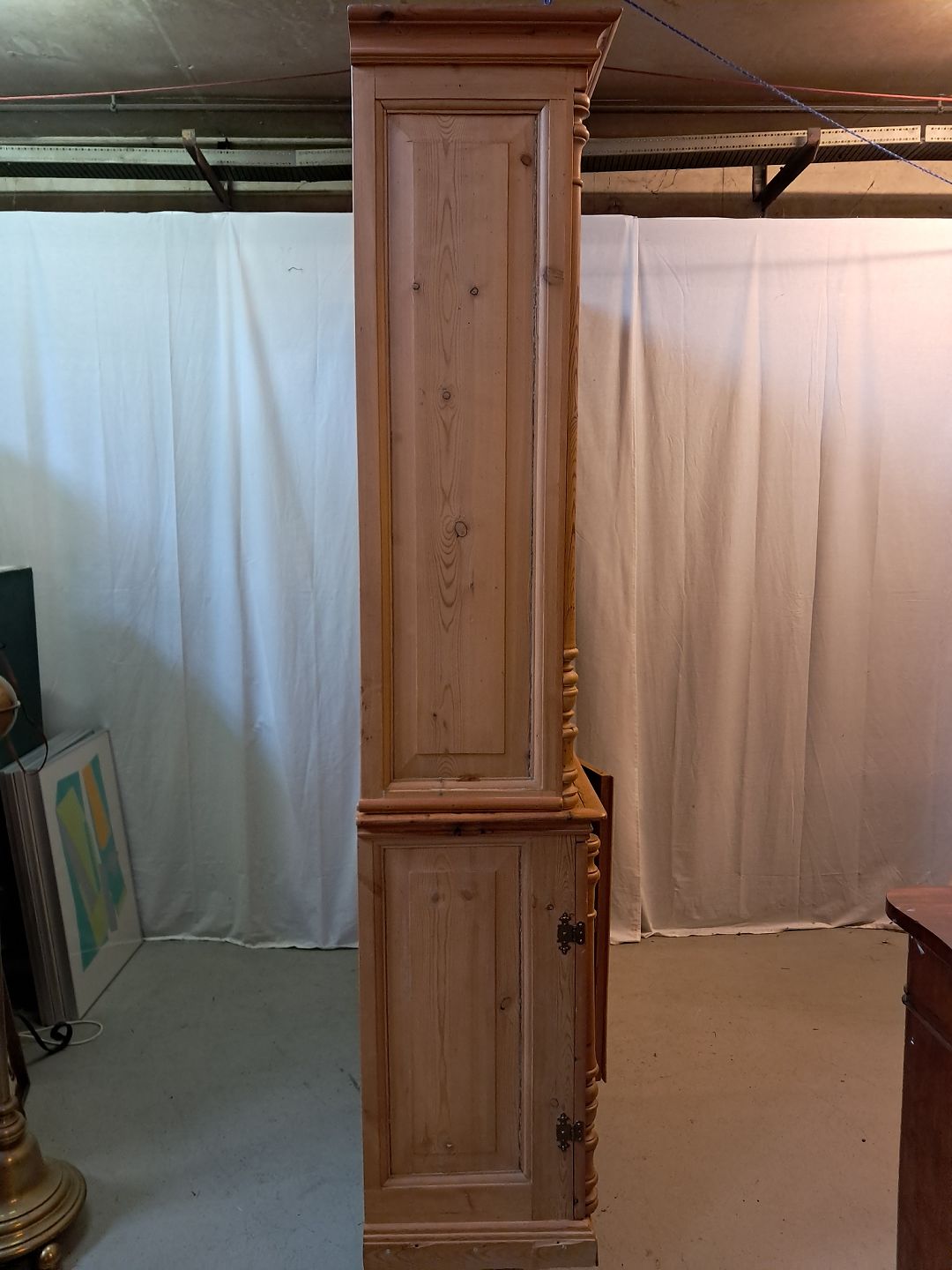 Skab med reol overdel i massivt fyrretræ, fra 1980erne.Det har brugsspor.