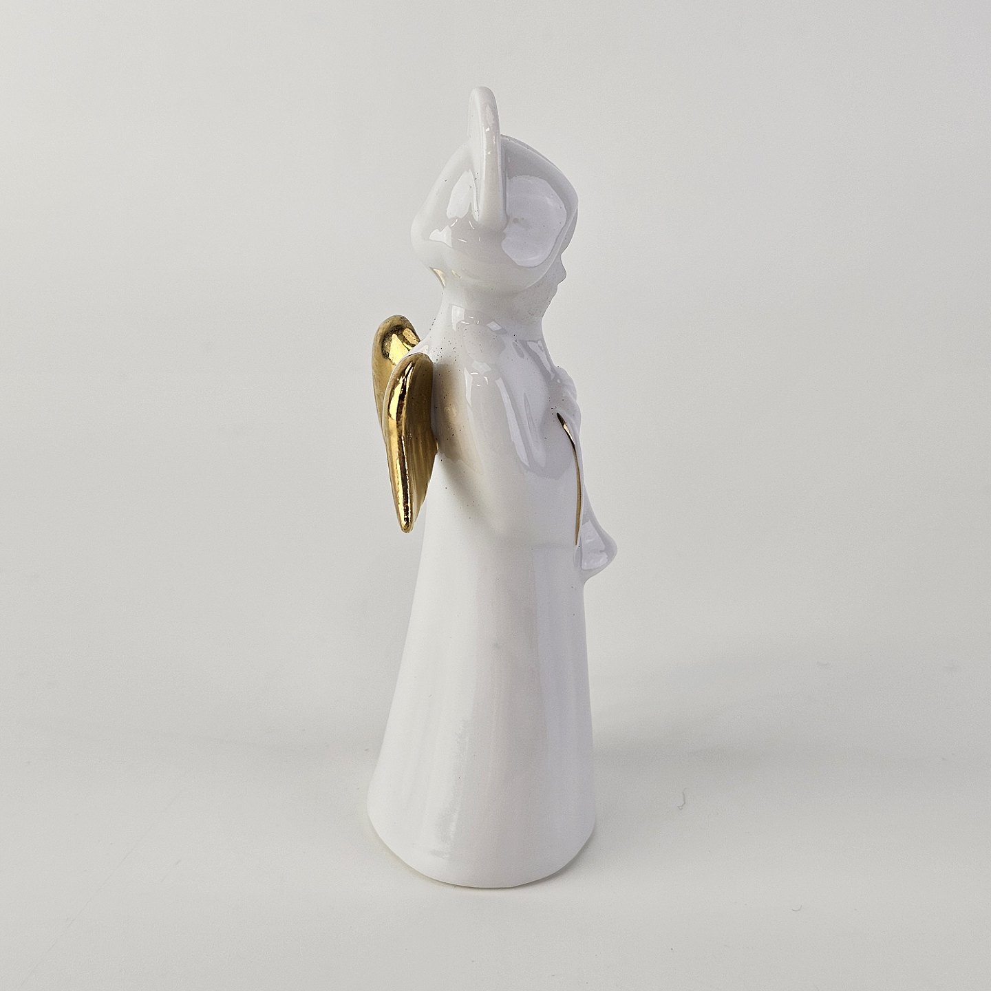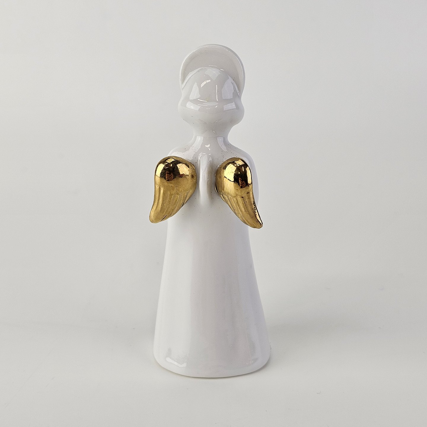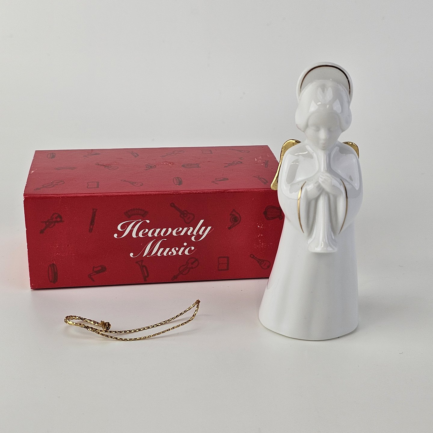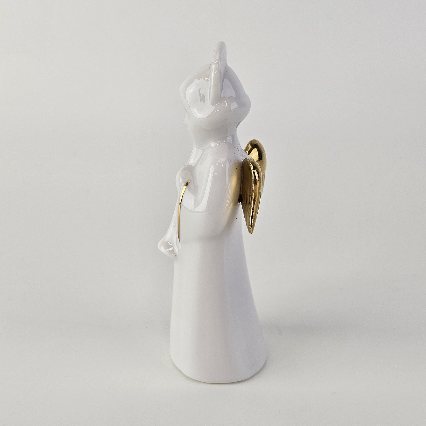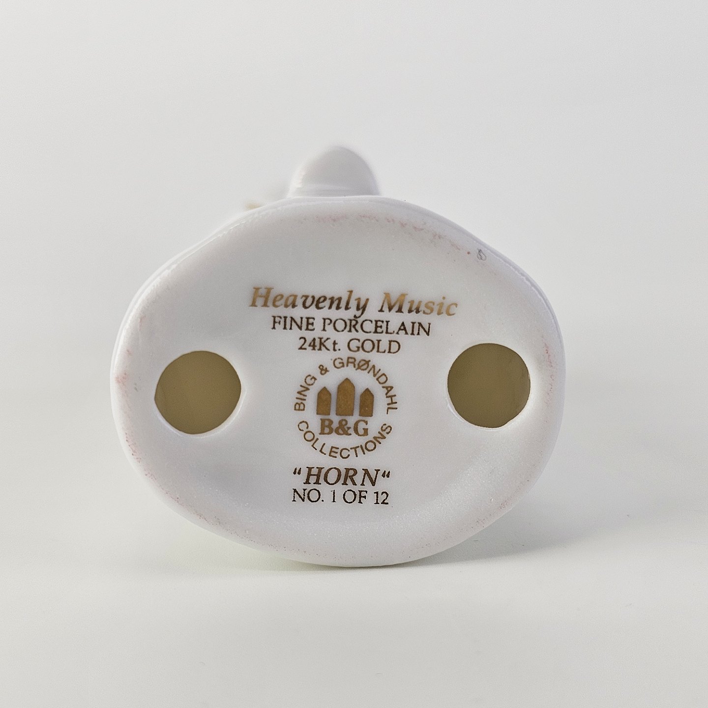 Figur med motiv af en engel som spiller på horn. Figuren er i hvidt porcelæn med forgyldte vinger og detaljer i 24 karat guld.1 af 12 i serien Heavenly Music med titlen Horn