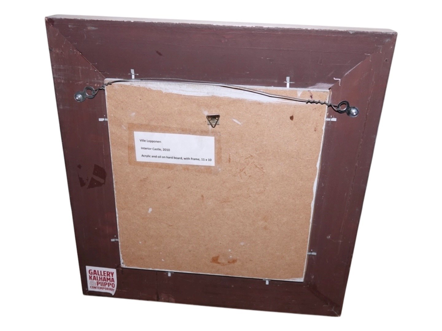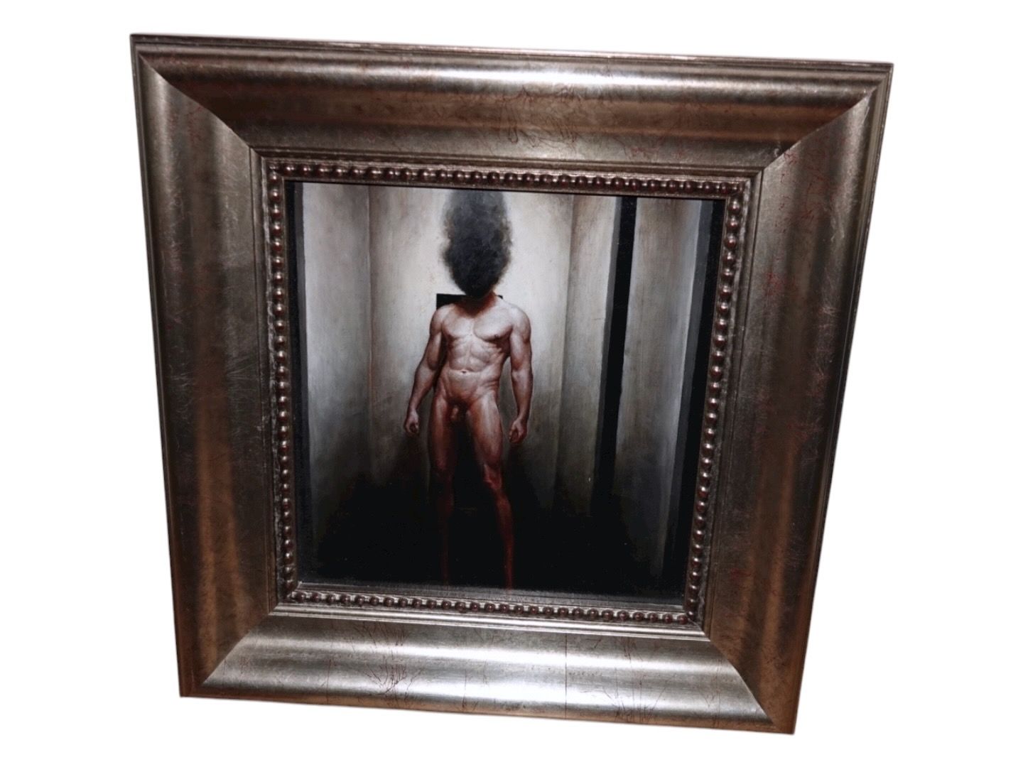 Ville Löppönen (født 1980 i Finland).Akryl og oliemaleri af nøgen mand i bred sølvramme fra 2010.
