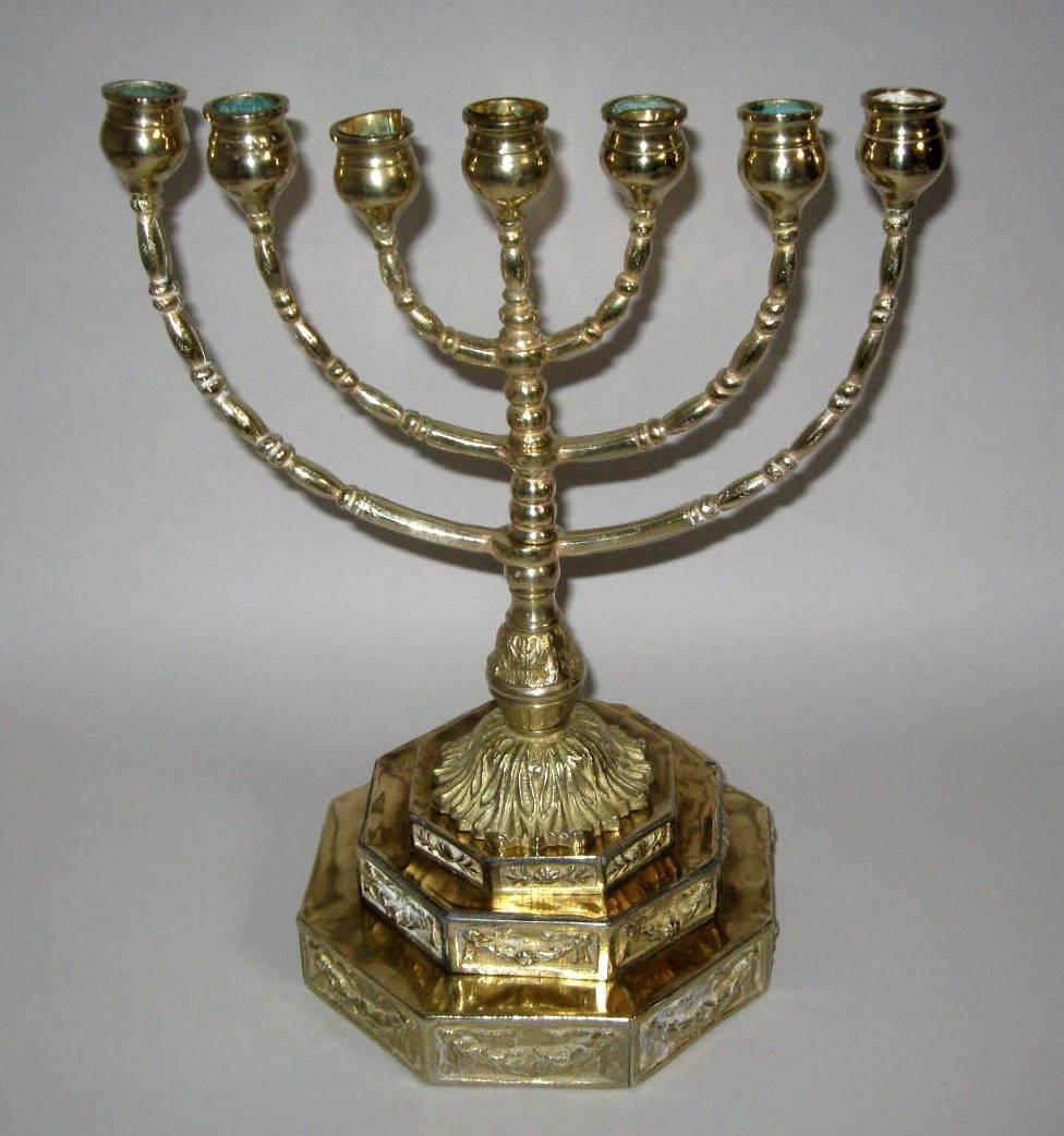 7 armet stage i messing/bronze, ca.1900. Med ottekantet fod med dekorationer i form af guirlander. Profileret stamme. Stagen indebærer symbolik både i gammel- og nytestamentelig betydning.Emne nummer: 6439