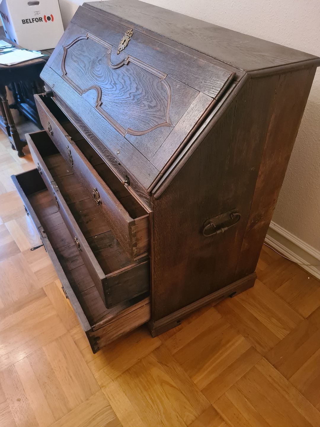 Chatol fra 1800 tallet i eg og med hemmelige skuffer. Fremstår pænt, funktionsdygtigt og velholdt.Højde 109 cm. Bredde 130 cm. Dybde 59 cm.