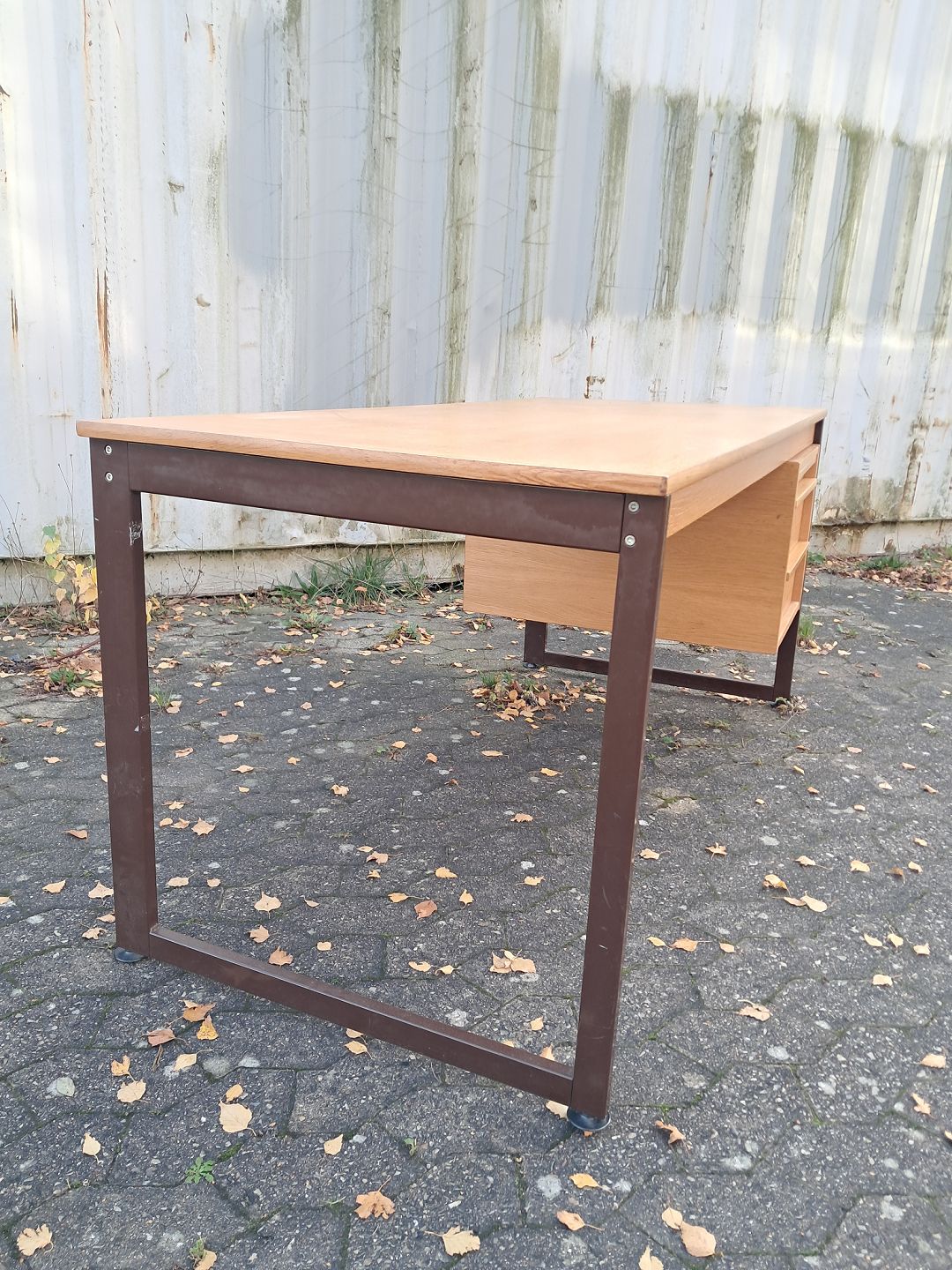 Skrivebord i fineret egetræ og metal, fra 1980erne.Det har brugsspor.