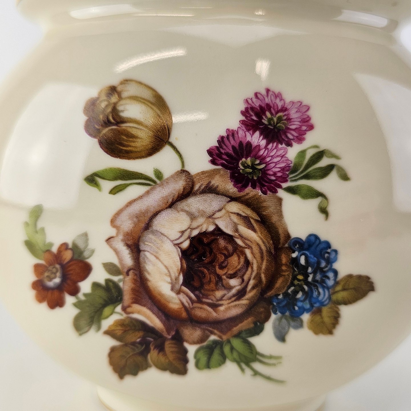 Rosenborg oval vase i cremefarvet porcelæn med guldkant og blomstermotivProducent Københavns Porcellains Maleri