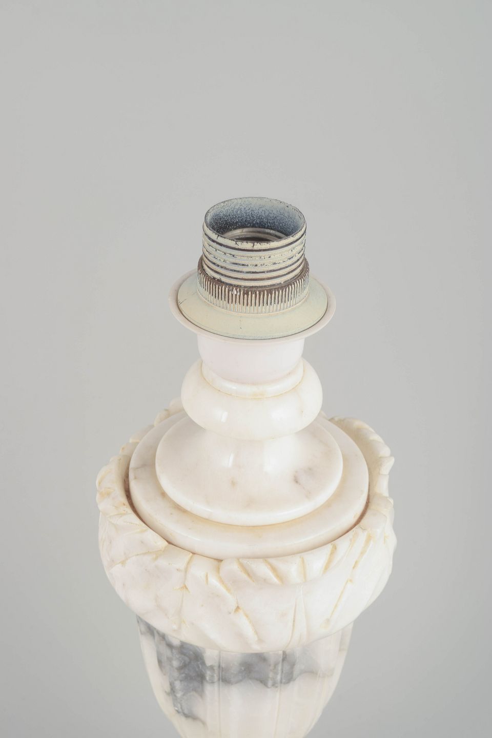 Italiensk alabaster bordlampe, midten af 1900-tallet.Større klassisk urneformet bordlampe udført i håndskåret alabast med markant fod og smukke grå årer i stenen. Et elegant eksempel på italiensk håndværk, der kombinerer klassiske proportioner med alabastens naturlige translucens.