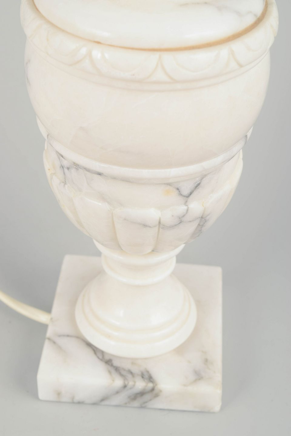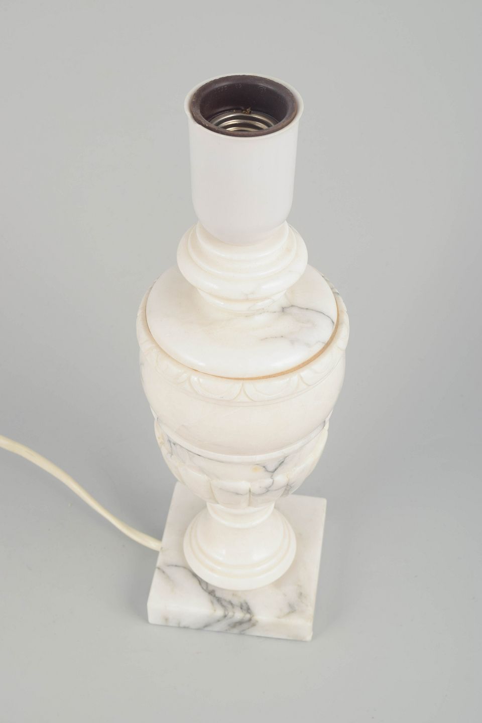 Italiensk alabaster bordlampe, midten af 1900-tallet.Klassisk urneformet bordlampe udført i alabast med firkantet fod og dekorativ guldfarvet ringdetalje. Et elegant eksempel på italiensk håndværk, der kombinerer klassiske proportioner med alabastens naturlige translucens.