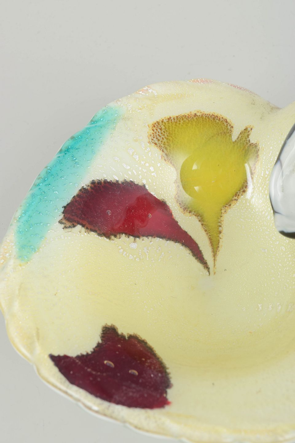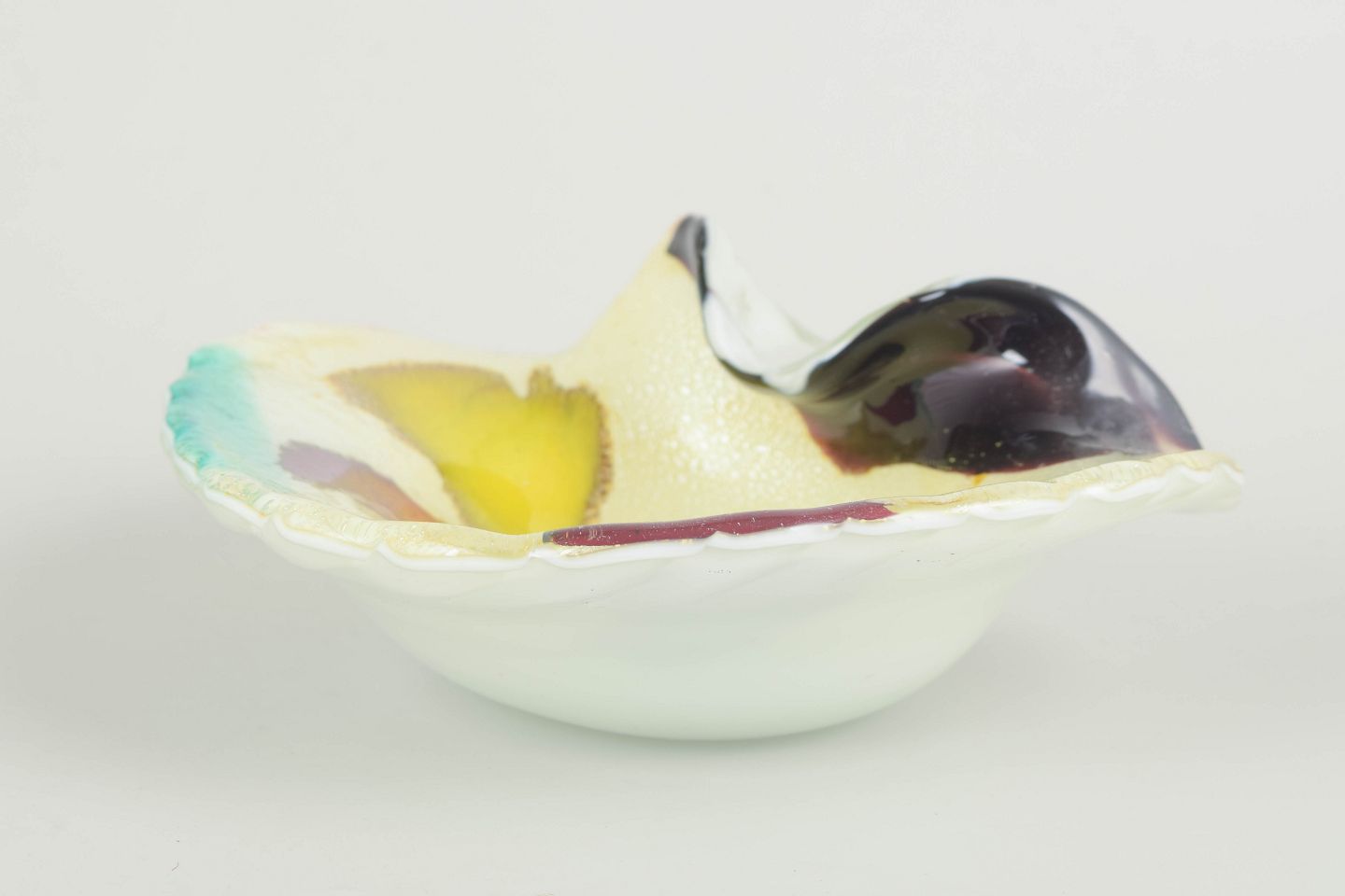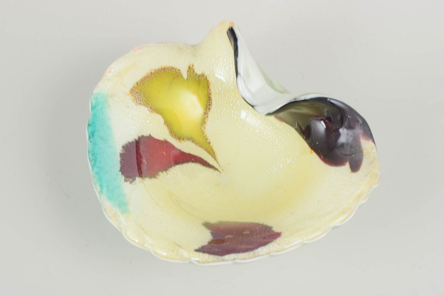 Murano kunstglasskål, 1960/70’erne.Dekorativ kunstglas skål i håndblæst glas med asymmetrisk form og flerfarvet glasur i gule, røde, turkise og mørke toner. Skålen har en udtalt plastisk form med bølgende kant og indre tekstur, typisk for Murano-glasværkernes eksperimenterende periode i midten af det 20. århundrede.