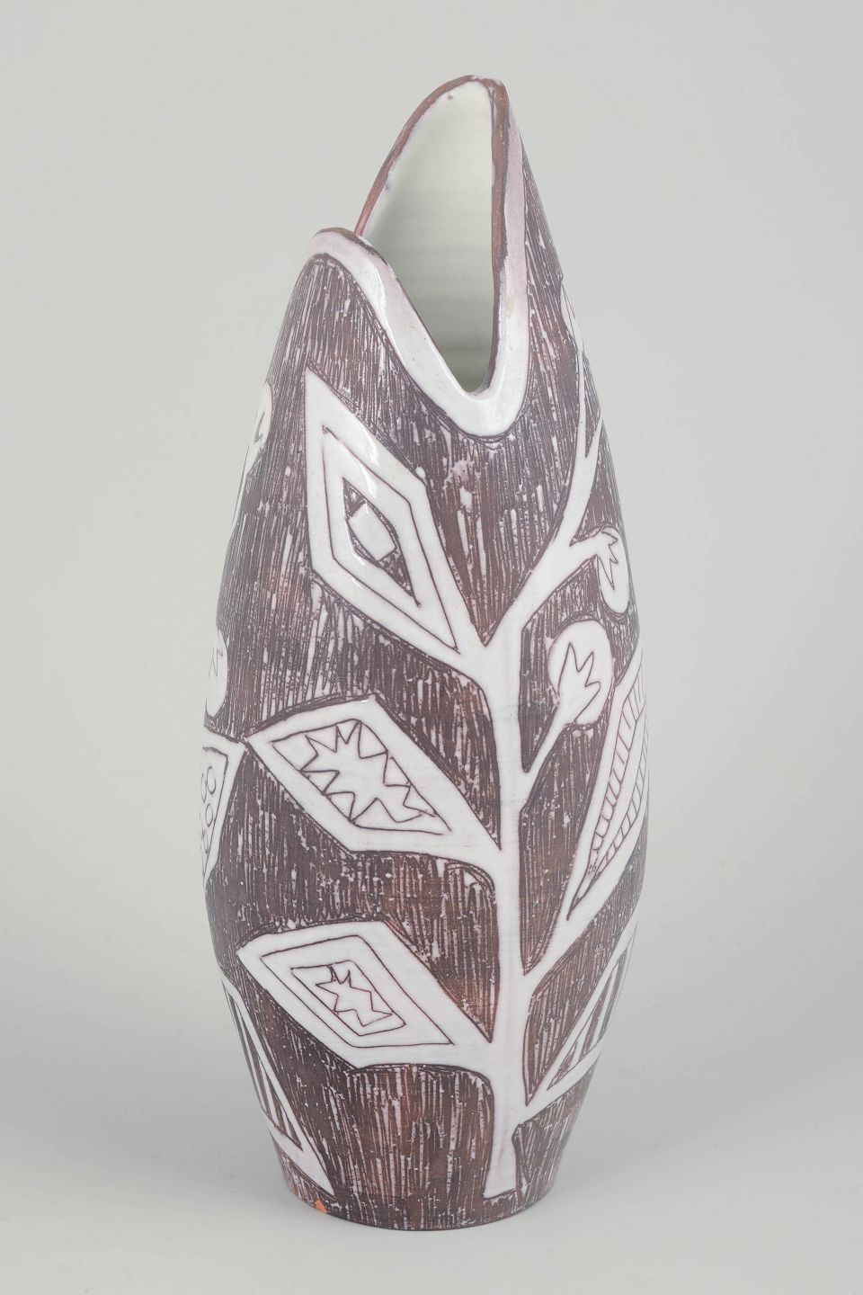 Håndlavet keramisk vase med markant asymmetrisk form og dekor i indridset grafisk mønster under brun og hvid glasur. Et karakteristisk eksempel på svensk studiokeramik fra 1960’erne med tydelig kunstnerisk signatur.