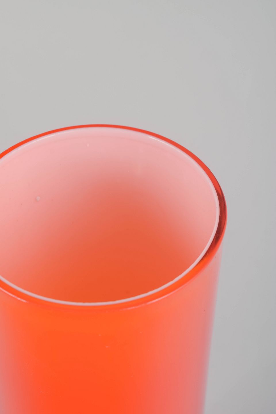 Elegant, mundblæst vase i klart orange glas med slank, cylindrisk form. Et tidstypisk eksempel på svensk glaskunst fra 1970’erne, hvor rene linjer og stærke farver spillede en central rolle i designudtrykket.