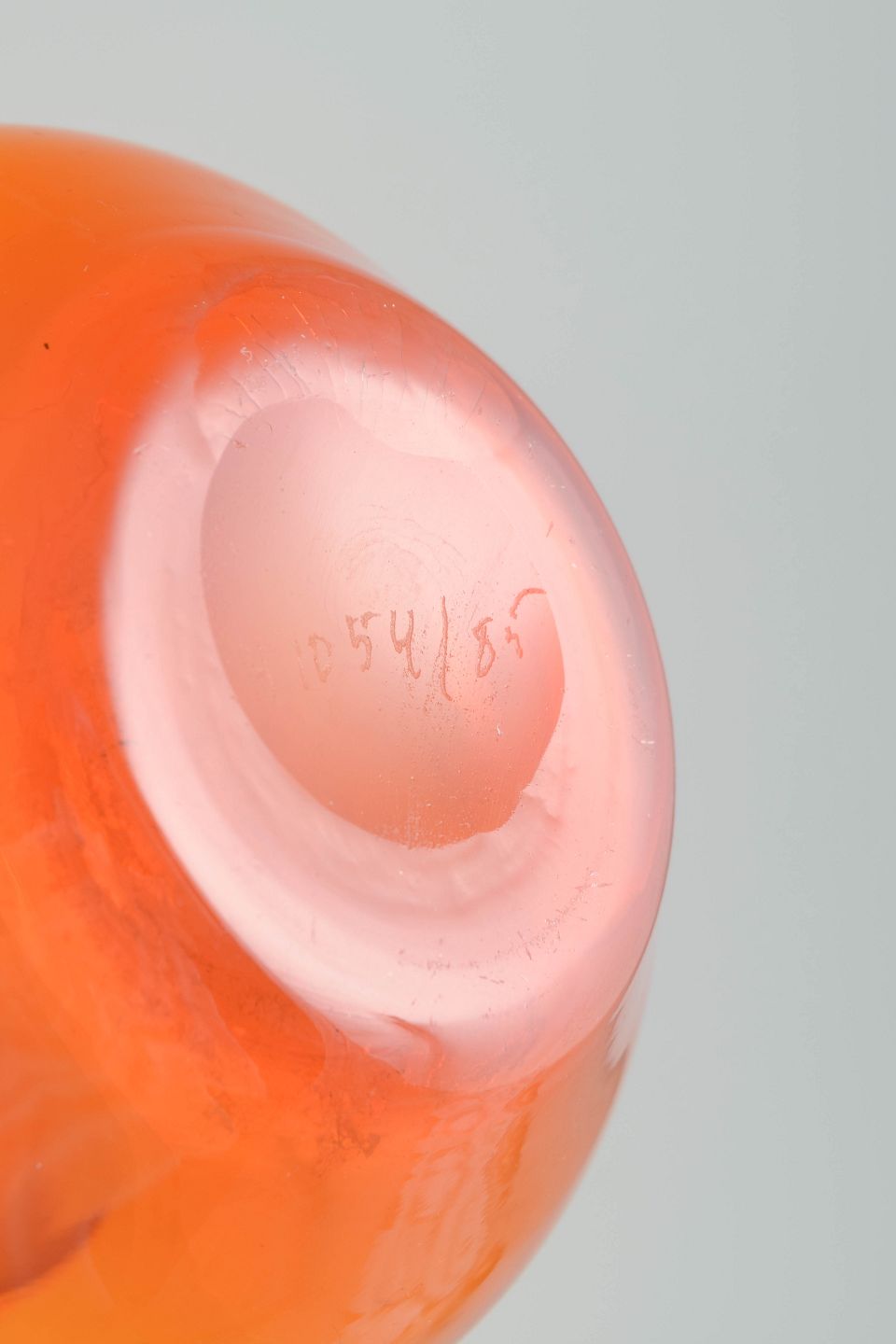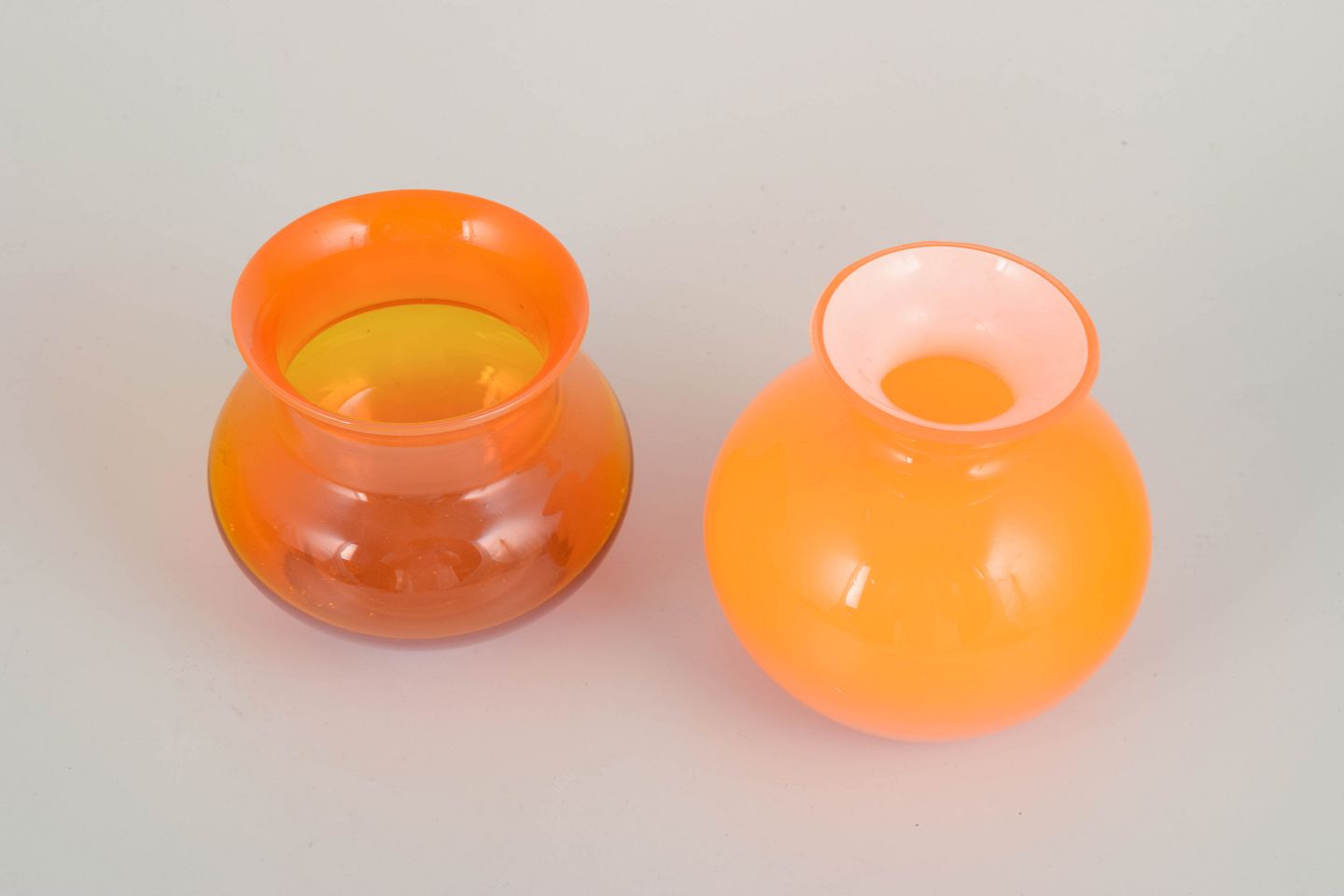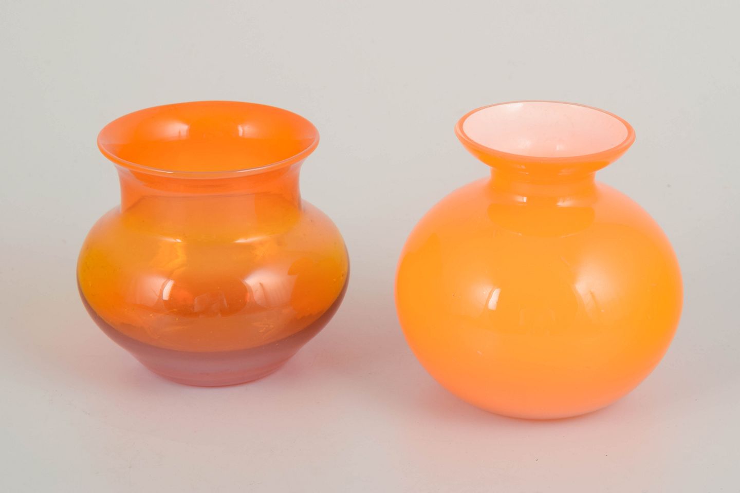 To mundblæste vaser i levende orange glas med blød, rund form og let indsnævret hals. Klassiske eksempler på skandinavisk glasdesign fra perioden med karakteristisk 70’er-farvespil og håndværksmæssig kvalitet.