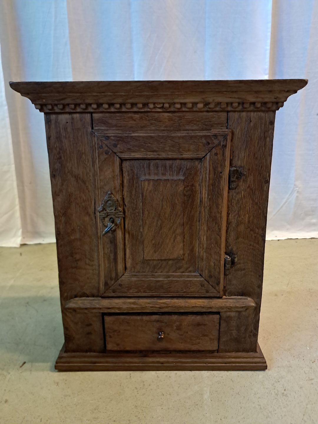 Vægskab i massivt egetræ, fra 1870erne.Det har brugsspor.
