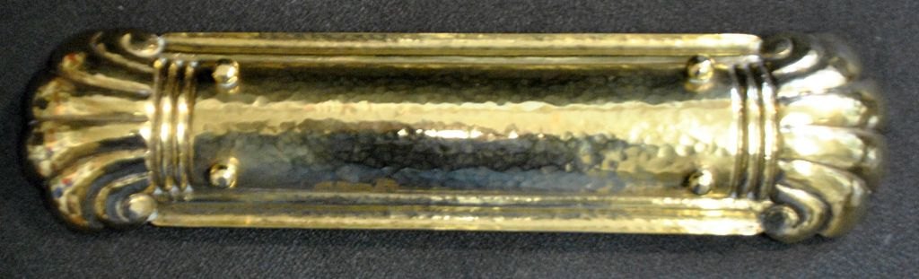 Messing penne holder, ca. 1920. Danmark. Hamret messing. Ender i form af vifter. På fire små fødder. L.: 33 cm. B.: 5 cm.Emne nummer: 28509