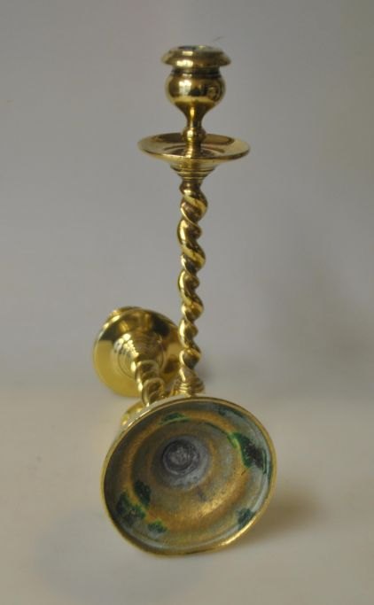 Par danske antikke messingstager, 19. årh. Med snoet stamme. H.: 19 cm.Emne nummer: 28512
