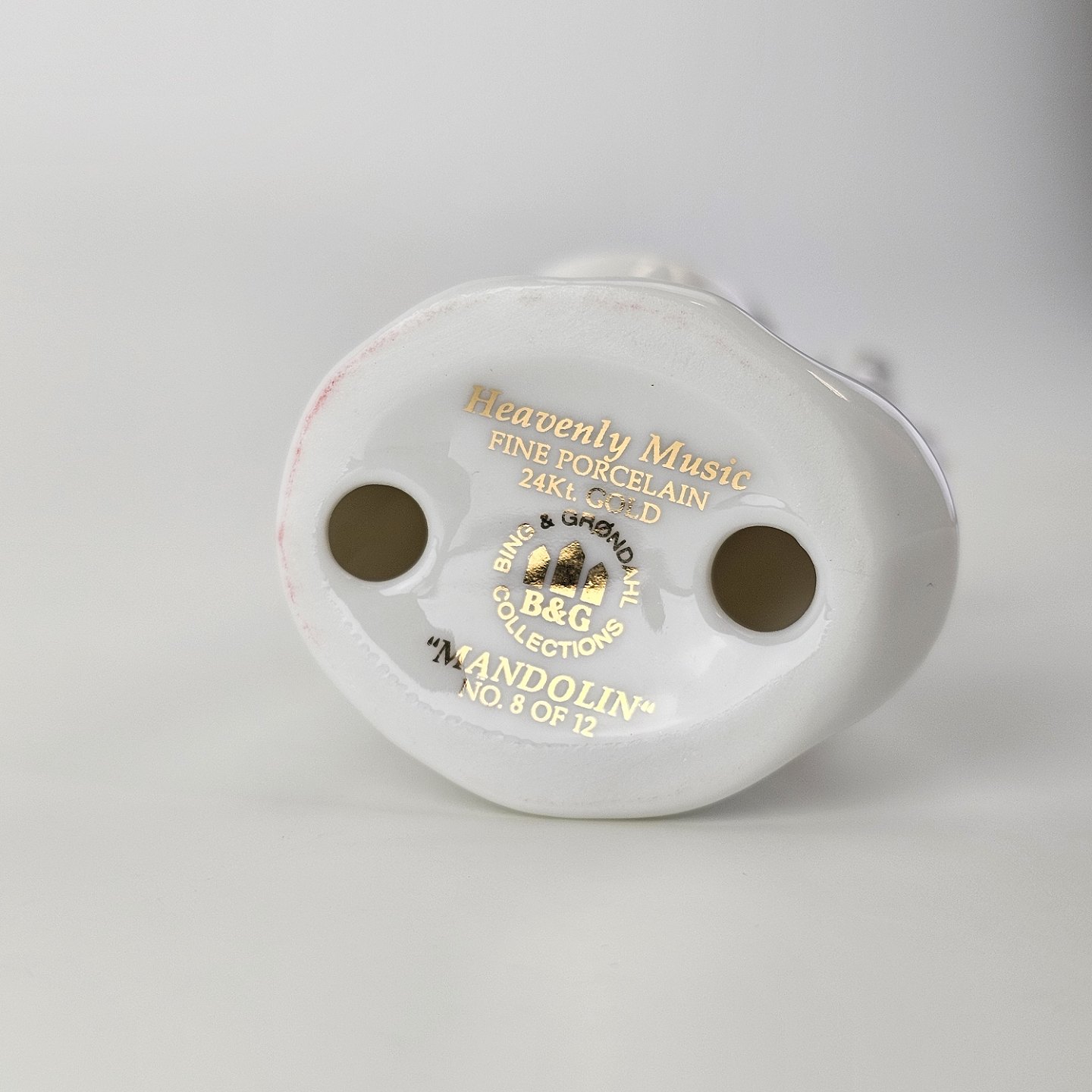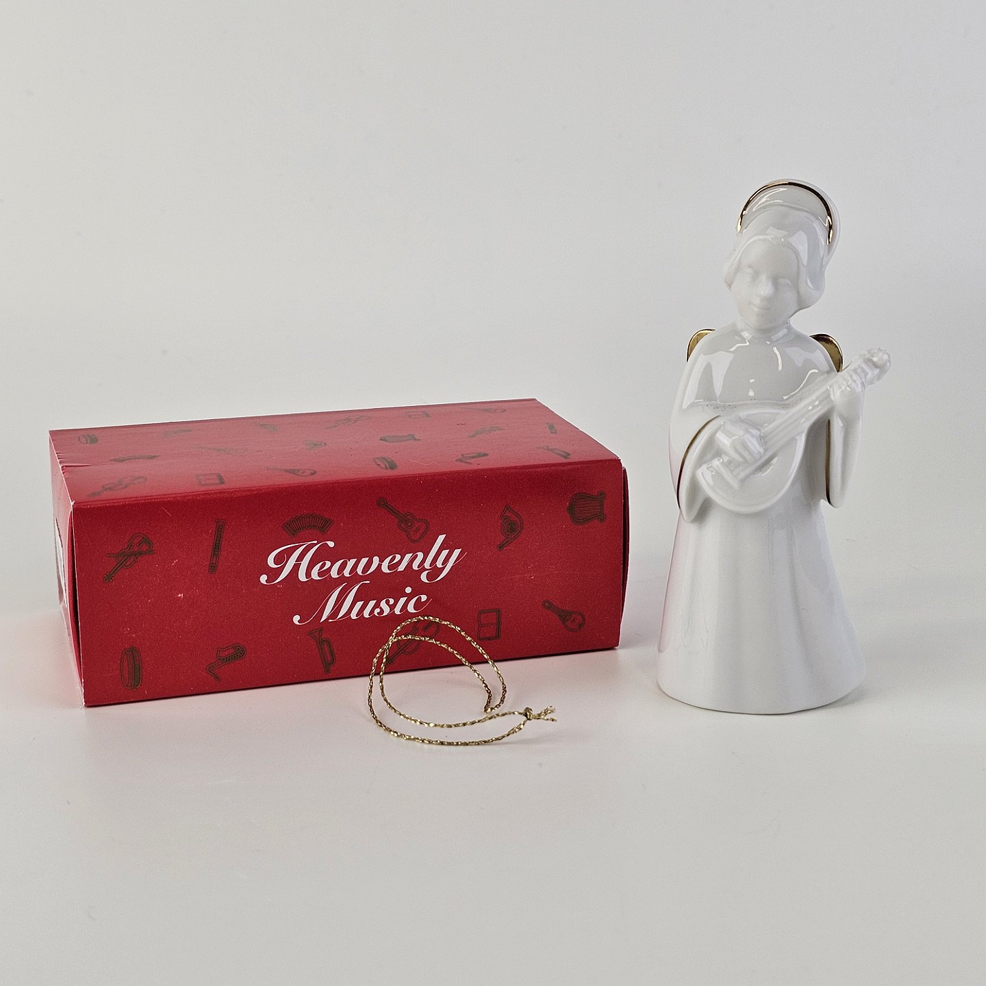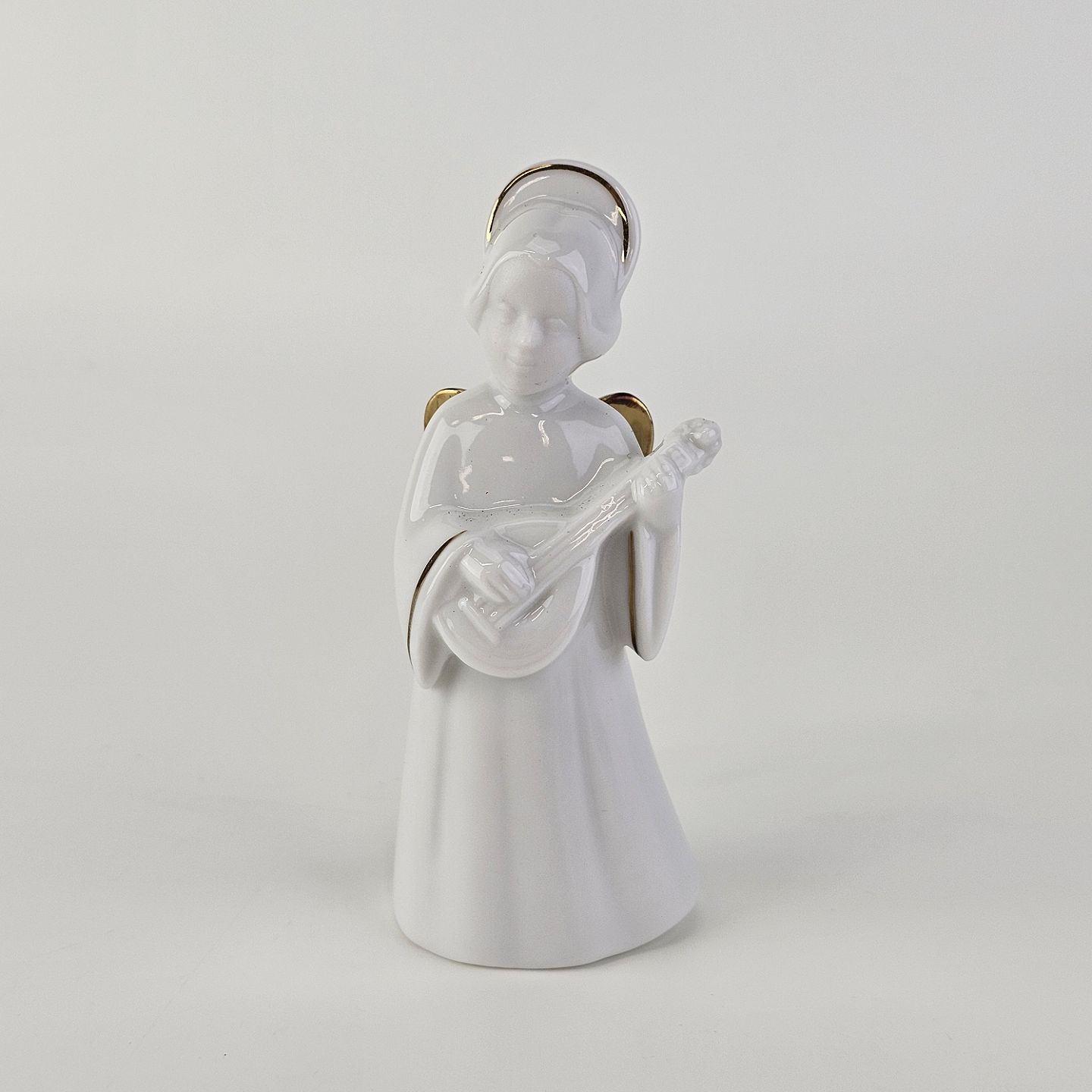 Figur med motiv af en engel som spiller på mandolin. Figuren er i hvidt porcelæn med forgyldte vinger og detaljer i 24 karat guld.12 af 12 i serien Heavenly Music med titlen Mandolin