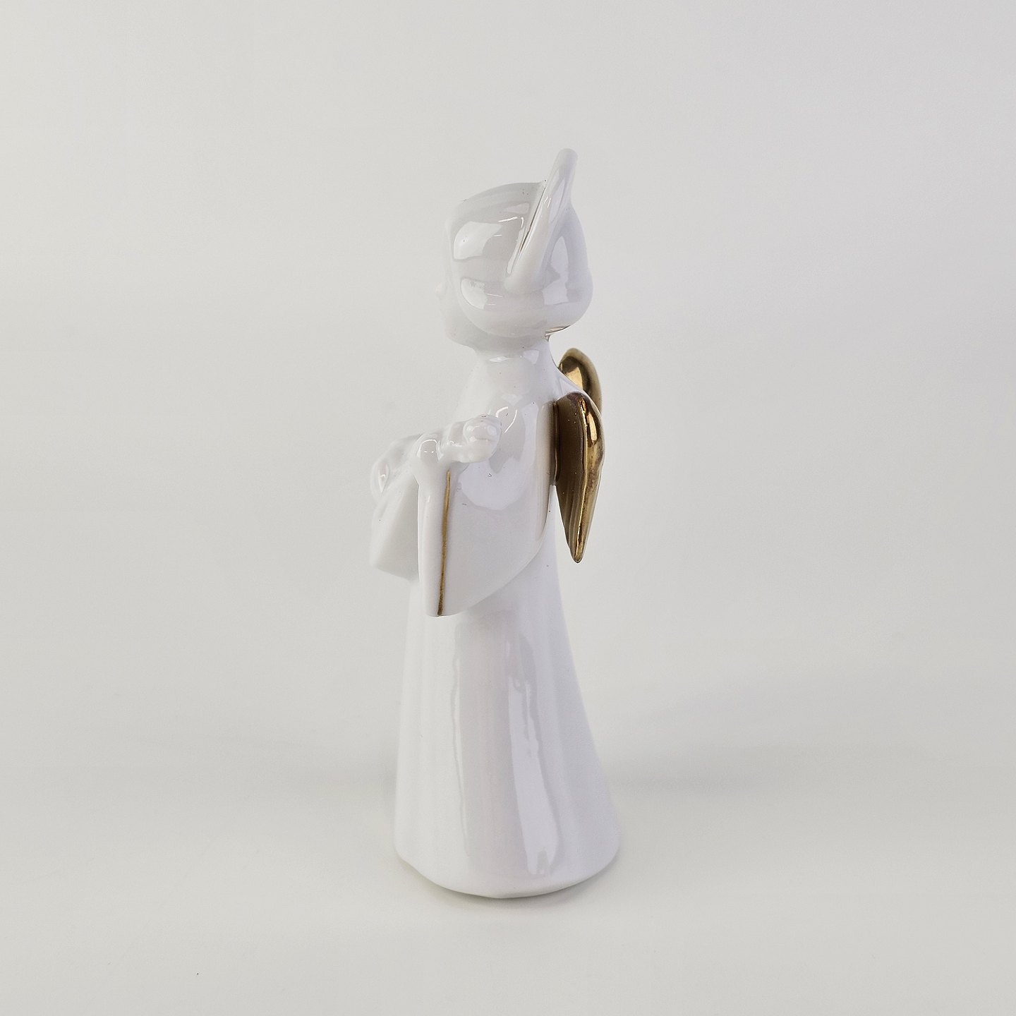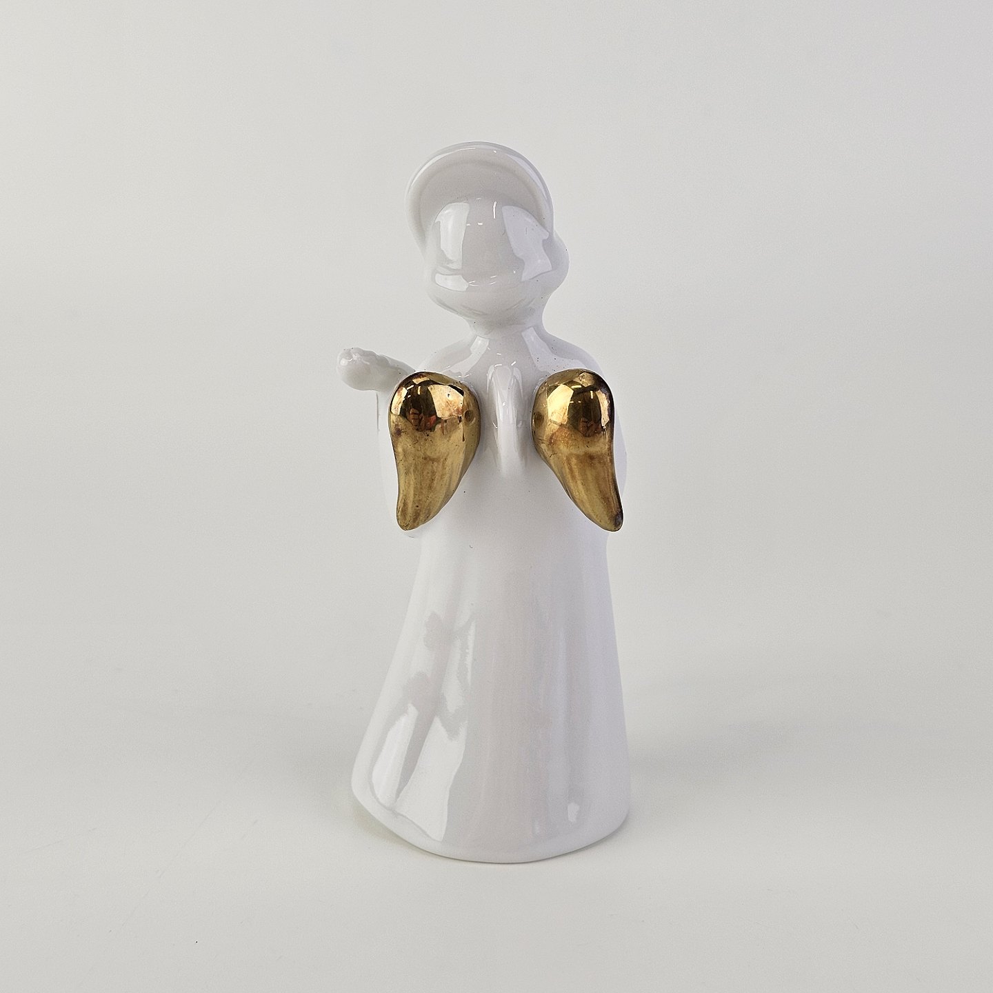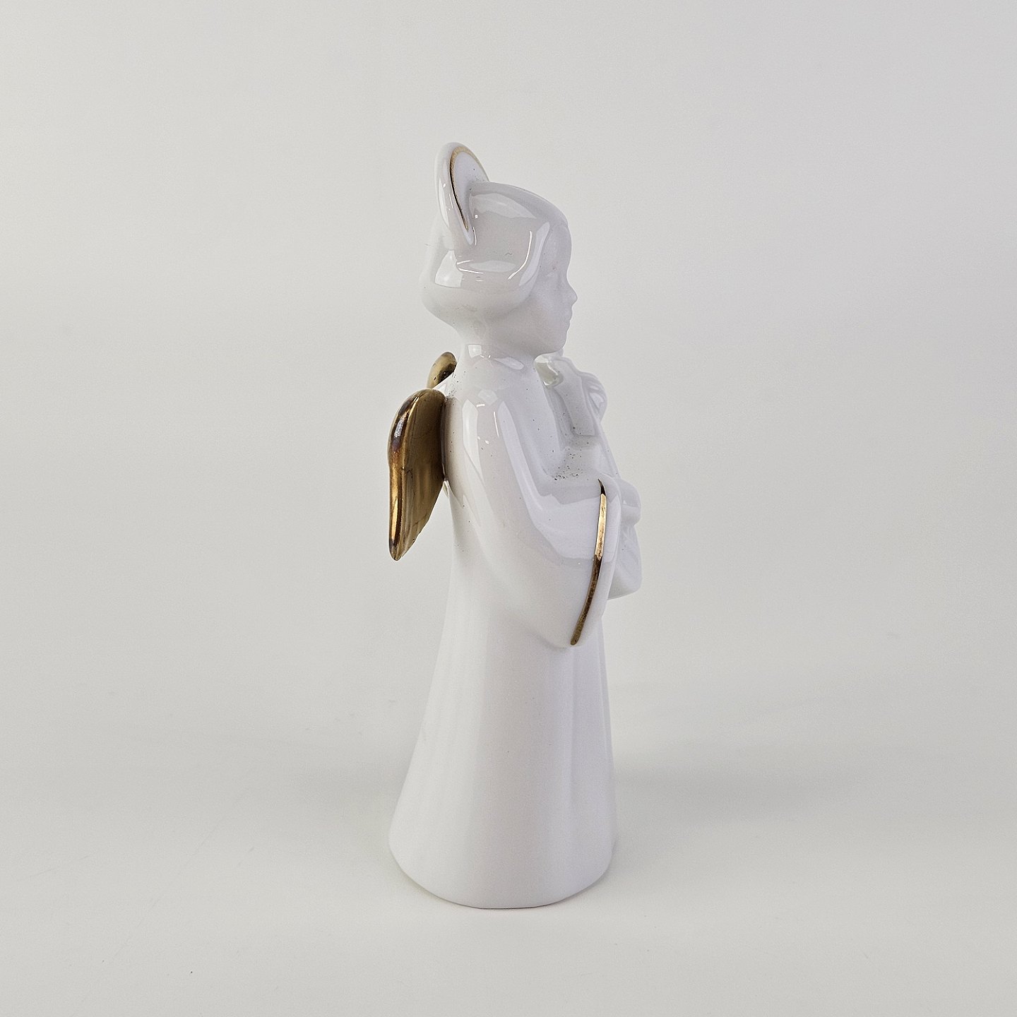Figur med motiv af en engel som spiller på mandolin. Figuren er i hvidt porcelæn med forgyldte vinger og detaljer i 24 karat guld.12 af 12 i serien Heavenly Music med titlen Mandolin