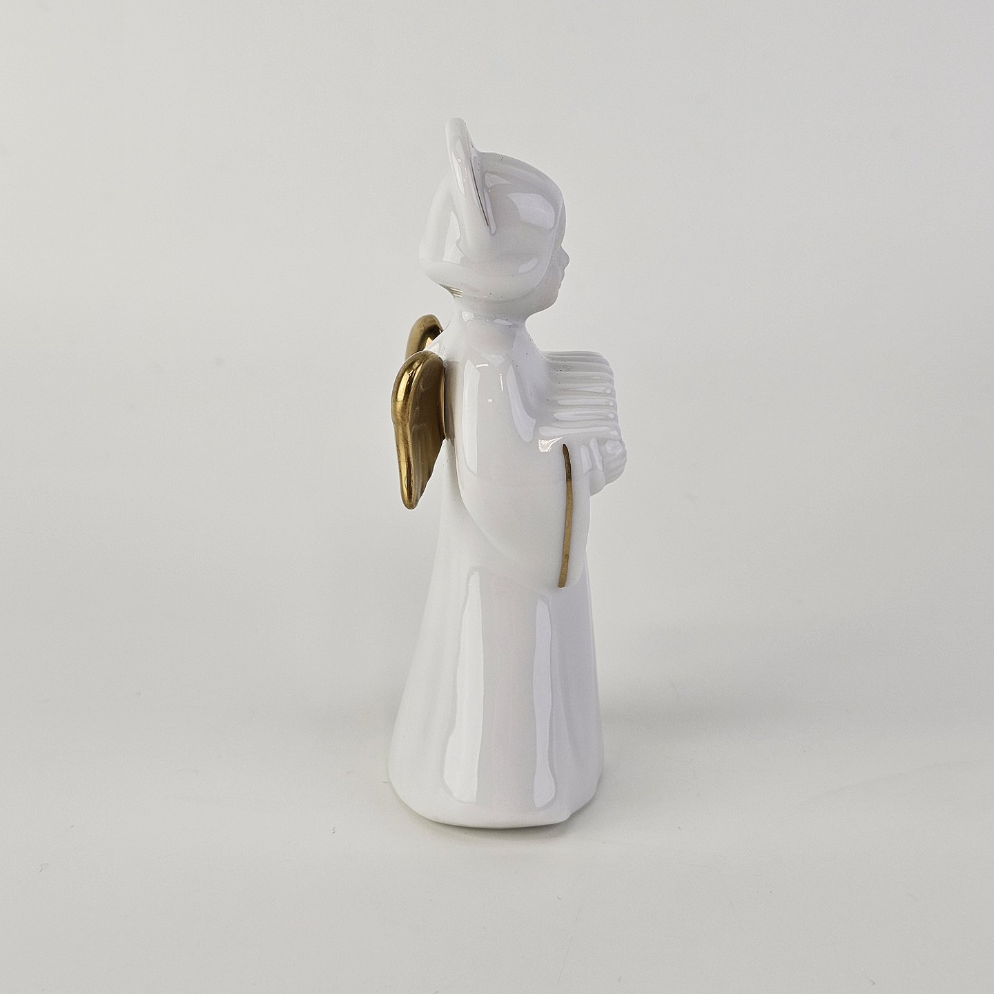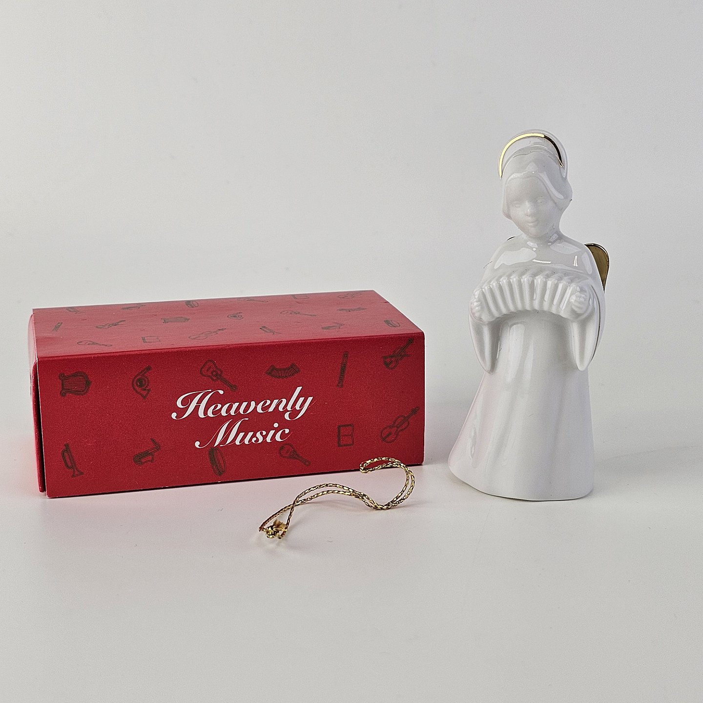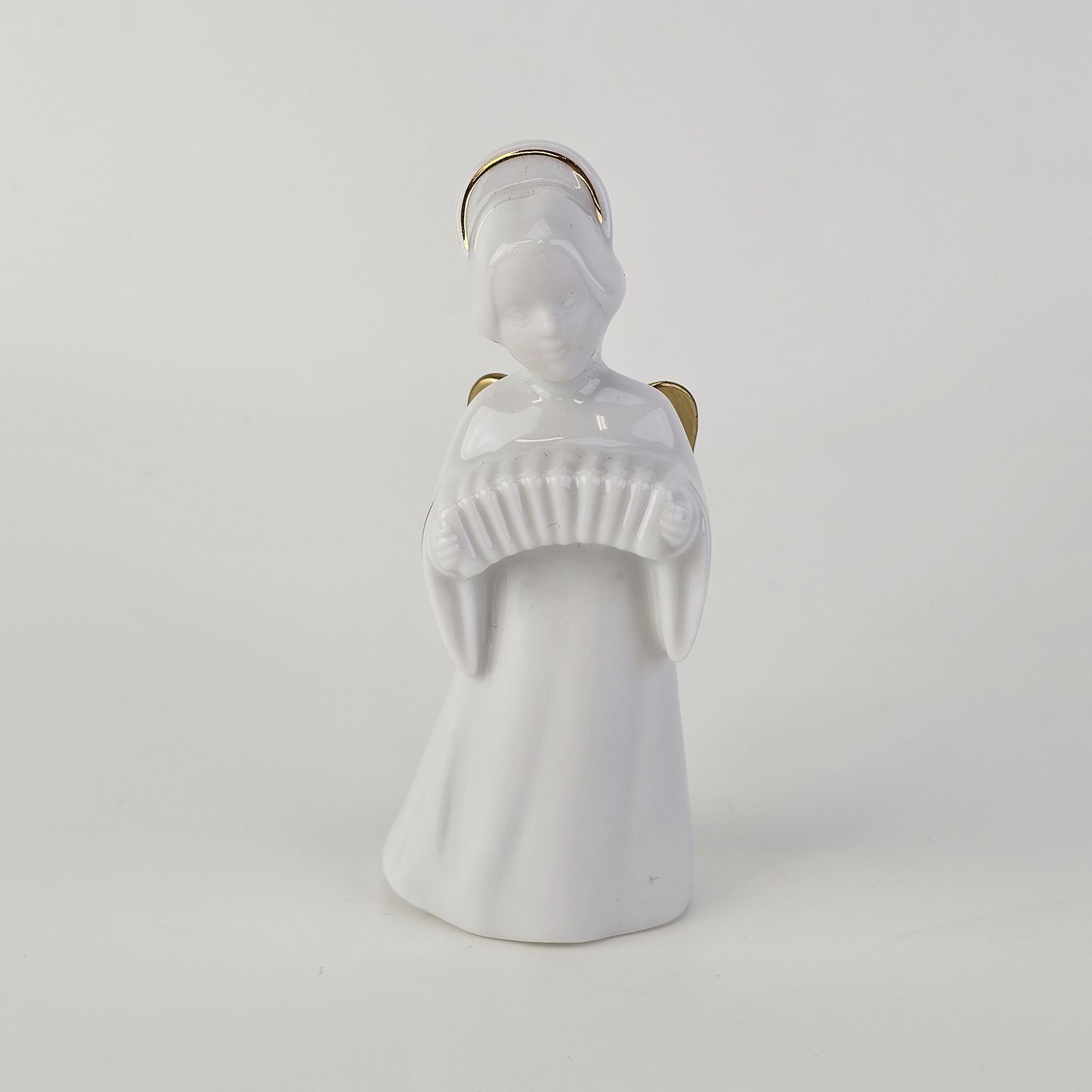 Figur med motiv af en engel som spiller på harmonika. Figuren er i hvidt porcelæn med forgyldte vinger og detaljer i 24 karat guld.9 af 12 i serien Heavenly Music med titlen Accordion