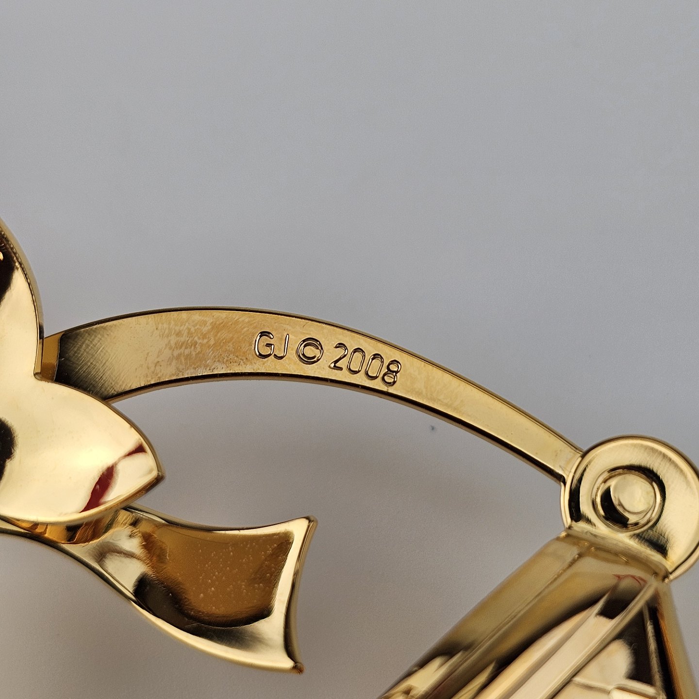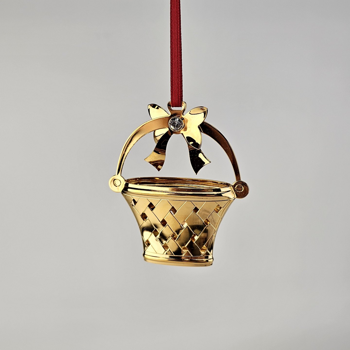 To juleornamenter til ophæng med form af en kurv og en julerose i messing forgyldt med 24 karat guldÅrets julepynt 2008, kommer i original kasse