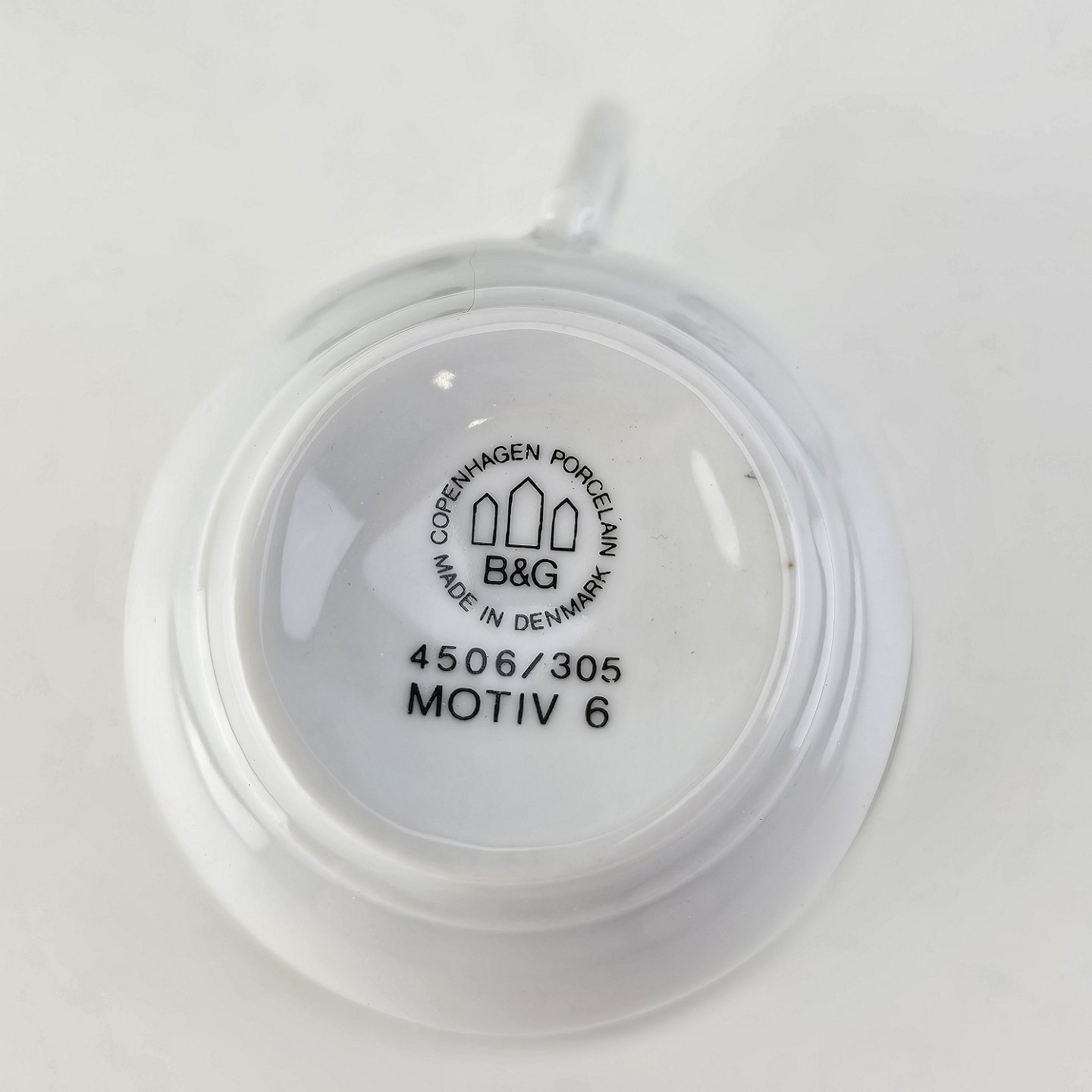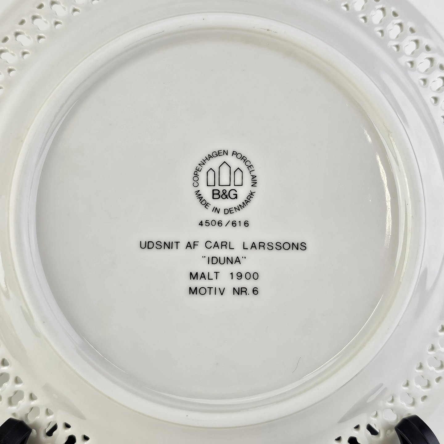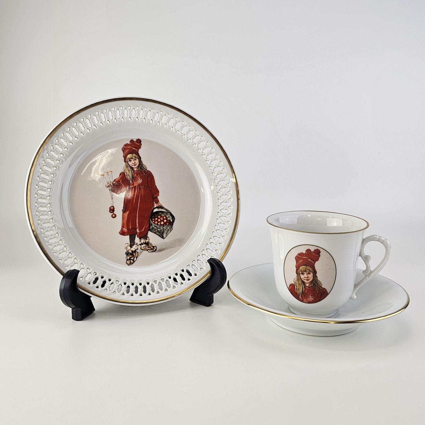 Kop med underkop i porcelæn med guldkant og platte i porcelæn med guldkant og udsnit af Carl Larsson malt 1900, fra Carl Larsson kaffestellet.Begge med motiv 6 Iduna