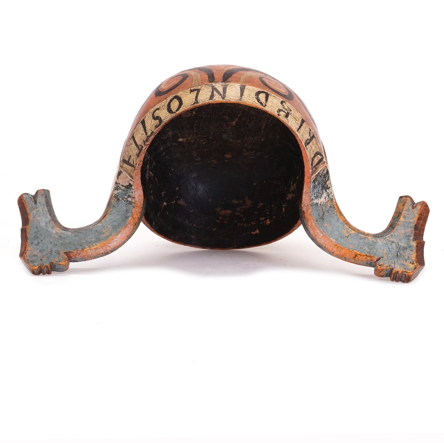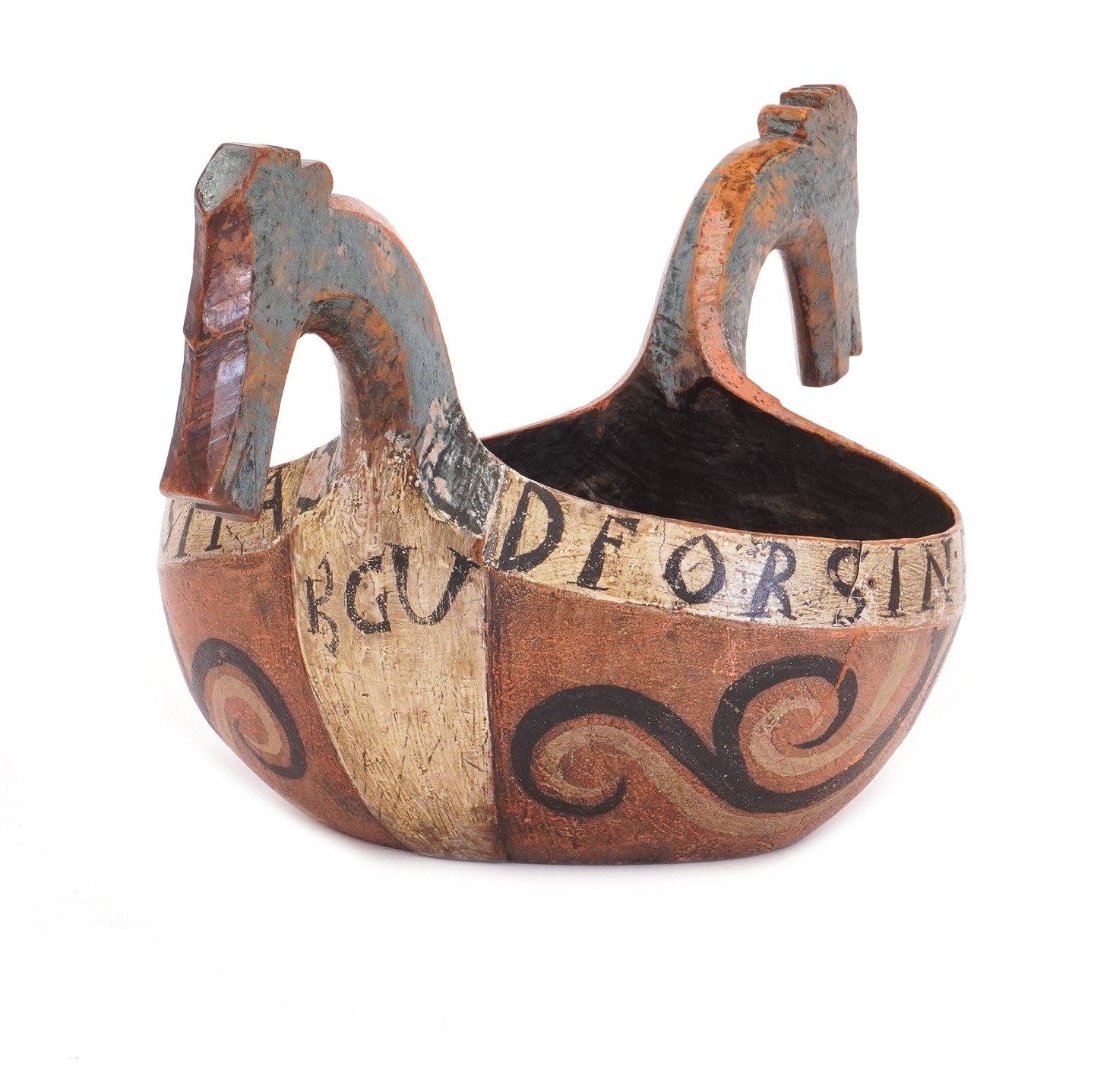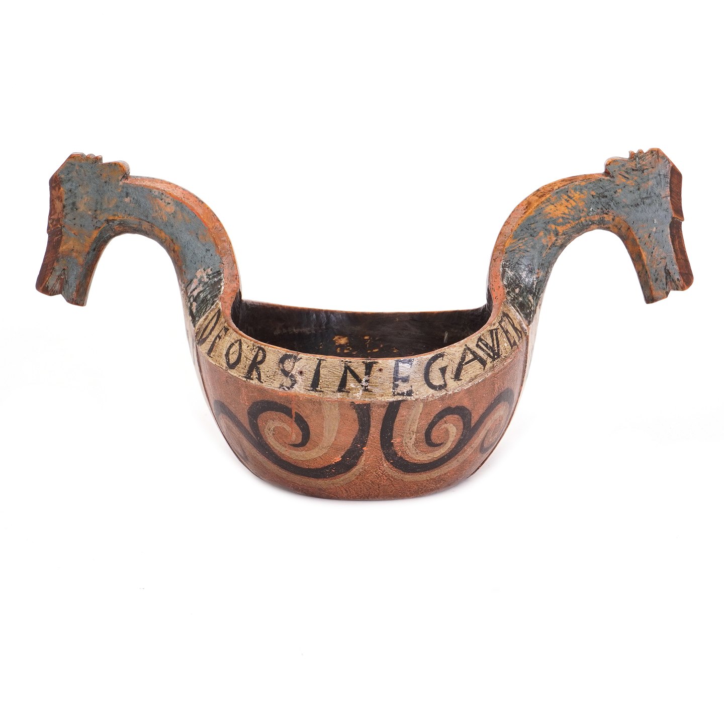 Norsk originaldekoreret ølbolle udskåret i træ med hanke i form af hestehovederDateret 1803. Sider med drikkevise