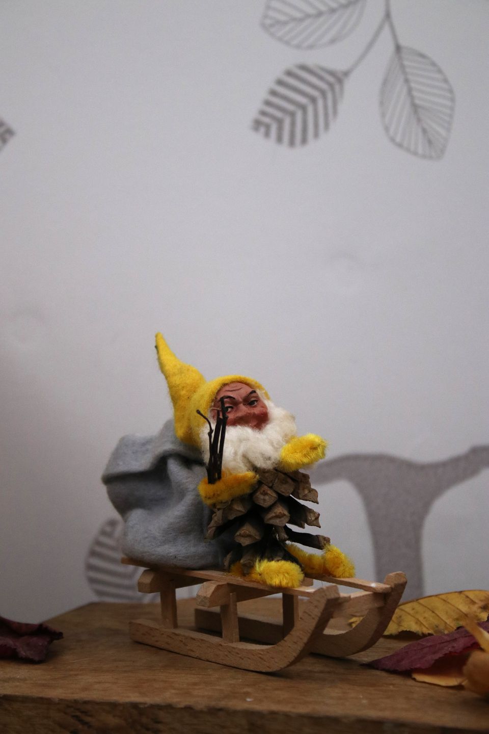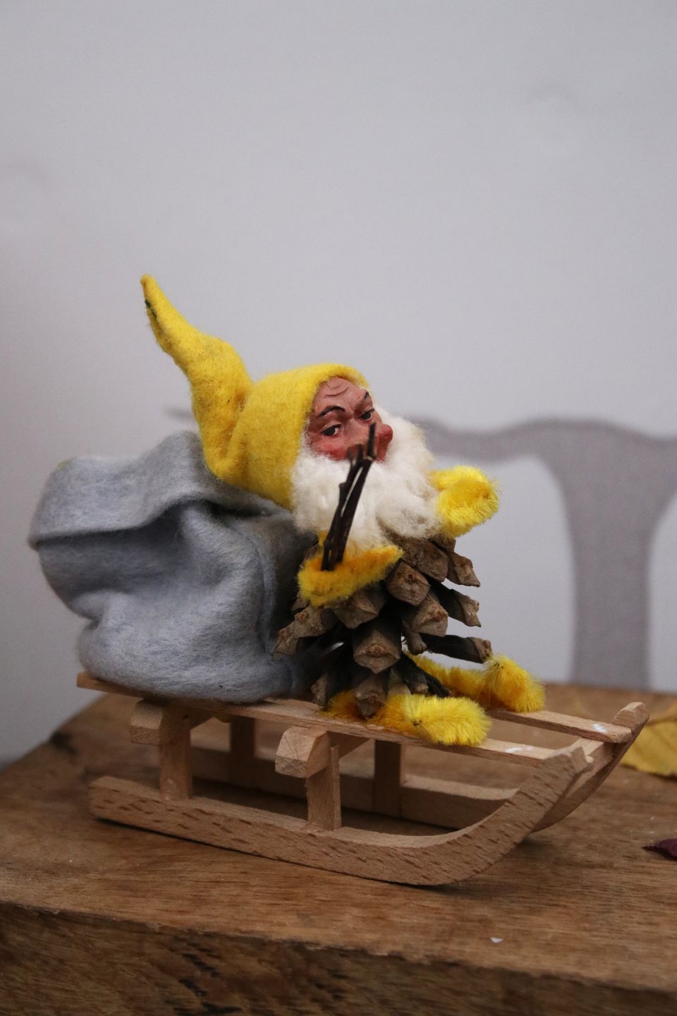 Gammel nisse på trækælk.Nissen er lavet af grankogle , piberenser ,bemalet ansigt og filt hue og julesæk. H: 10cm. L: 11cm.