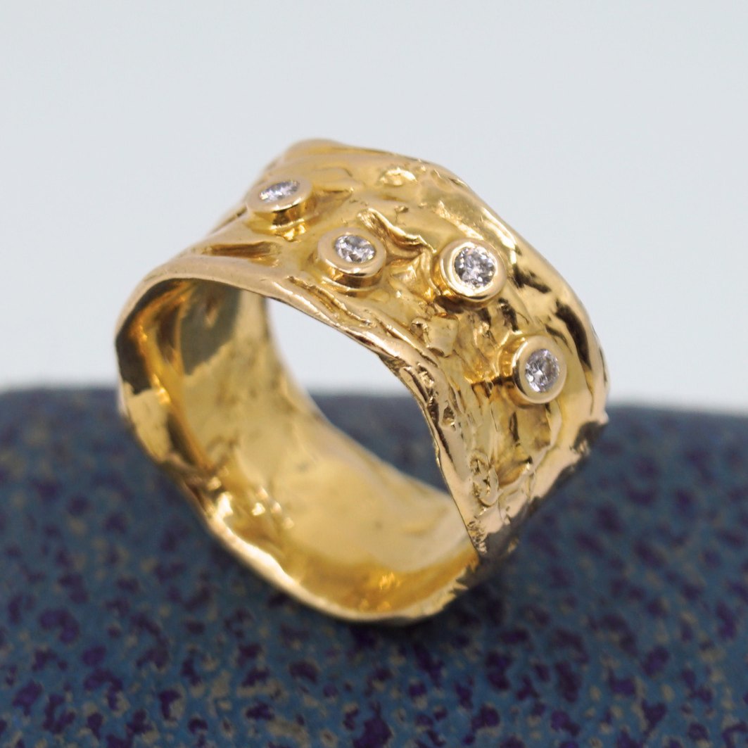 Henning Skovgaard; Bred ring i 14 kt. guld, prydet med fire diamanter, i alt 0.20 ct. Ring str. 53. Stemplet "585 GIG".Henning Skovgaard, guldsmed Glamsbjerg, est. 1994.