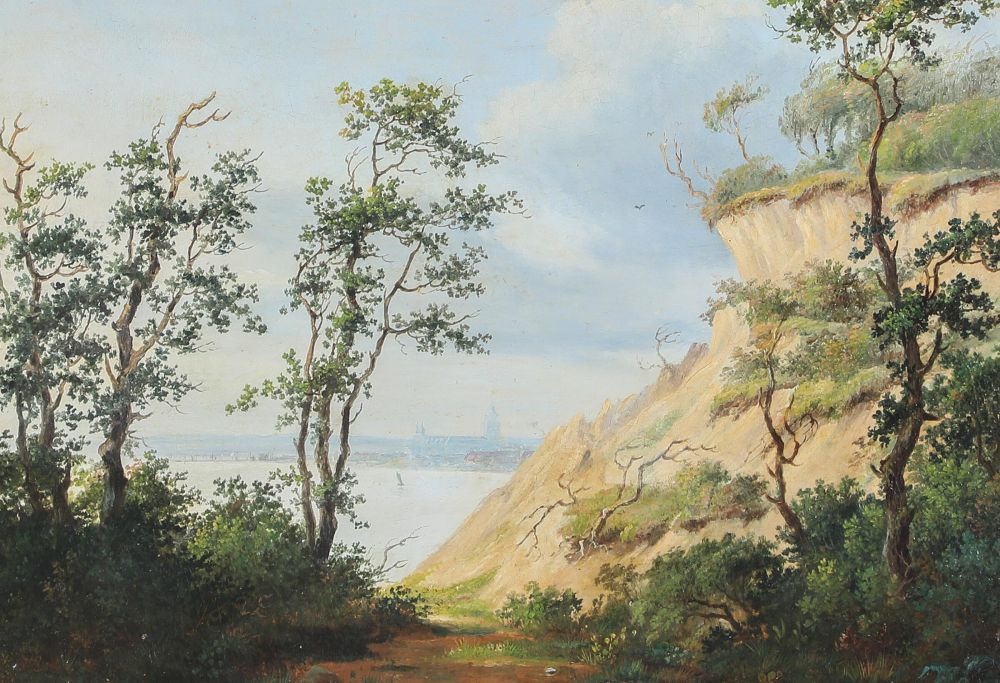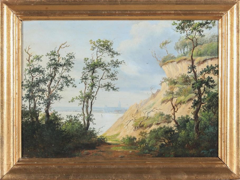 Holm, Peter (1798 - 1875) Danmark. Sommerlandskab med over Aarhus Bugt og byen, set fra skrænterne i Risskov. Olie på metalplade. Signeret P. Holm (n.t.v.) 18 x 25 cm.Indrammet i en lille forgyldt træramme22,5 x 30,5 cm.