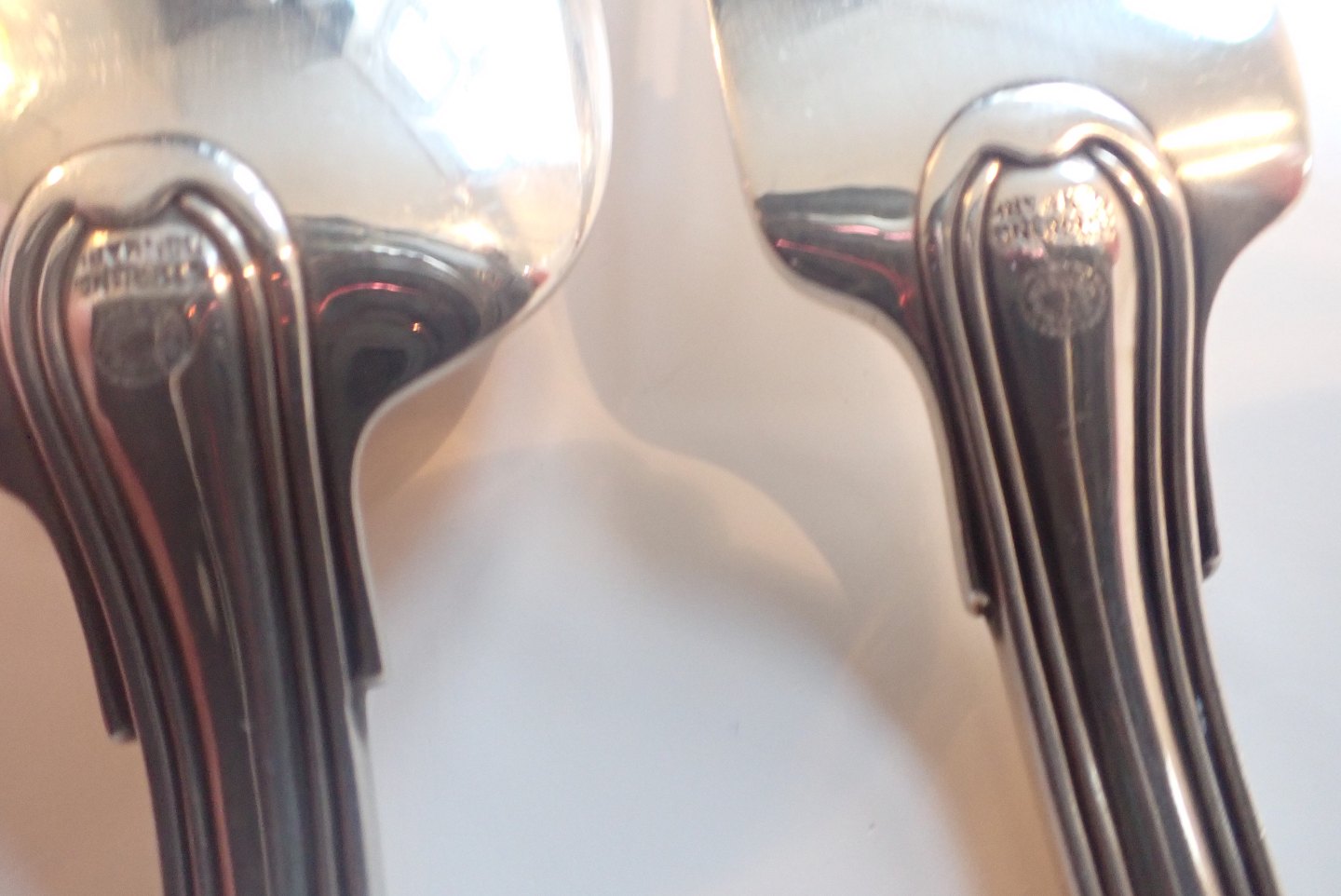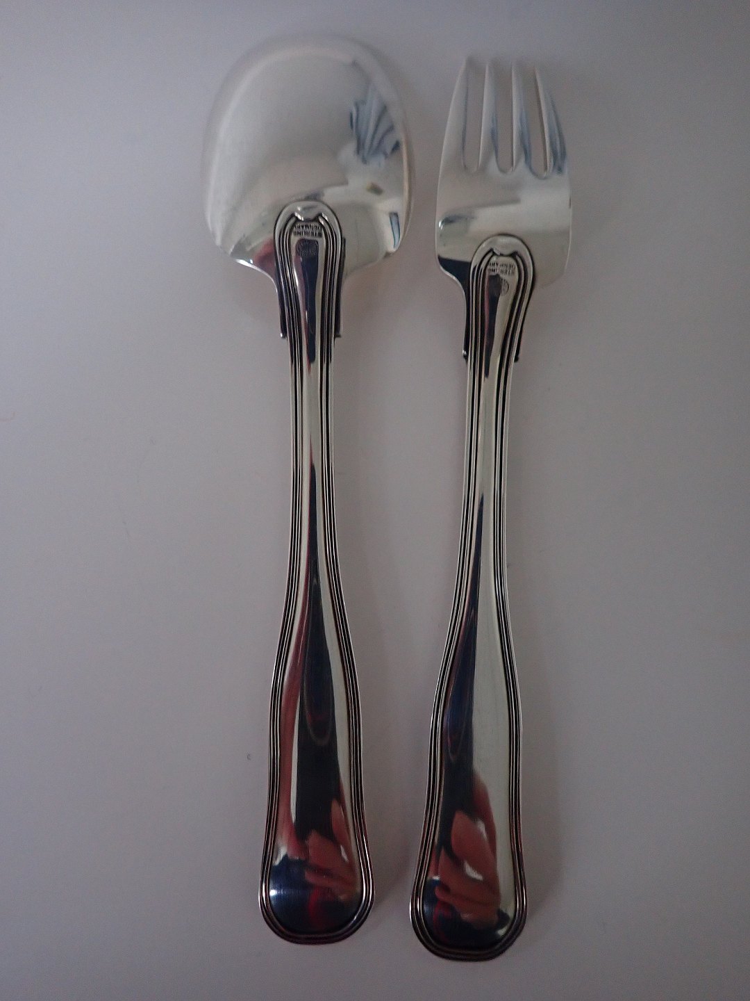 Georg Jensen -dobbeltriflet barnesæt med ske og gaffel i sterling sølv. Efter 1945. Samlet vægt: 79,5 gram. Længde på ske: 15,4 cm. Længde på gaffel 15,2 cm. I fin nærmest ubrugt stand. Udstiller
