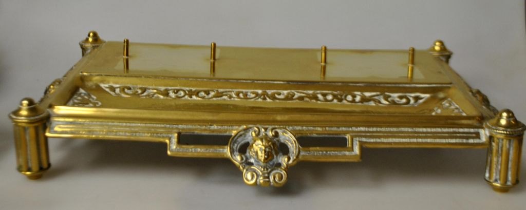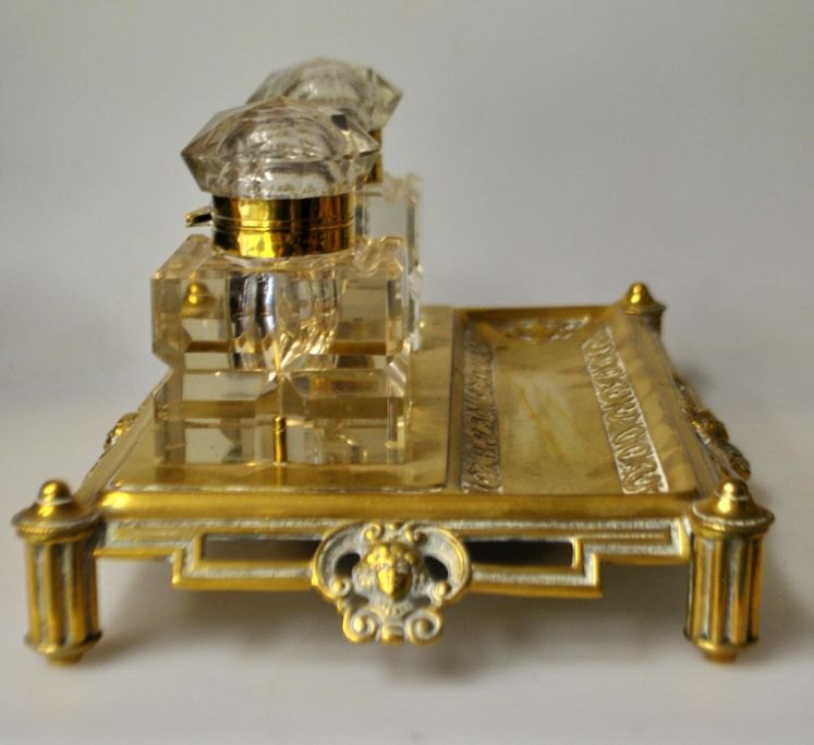 Antikt skrivesæt i messing med krystal beholdere, 19. årh. Tyskland. Fad dekoreret med engle hoveder. L.: 29 cm. B.: 23 cm. H.: 15 cm.Emne nummer: 28347