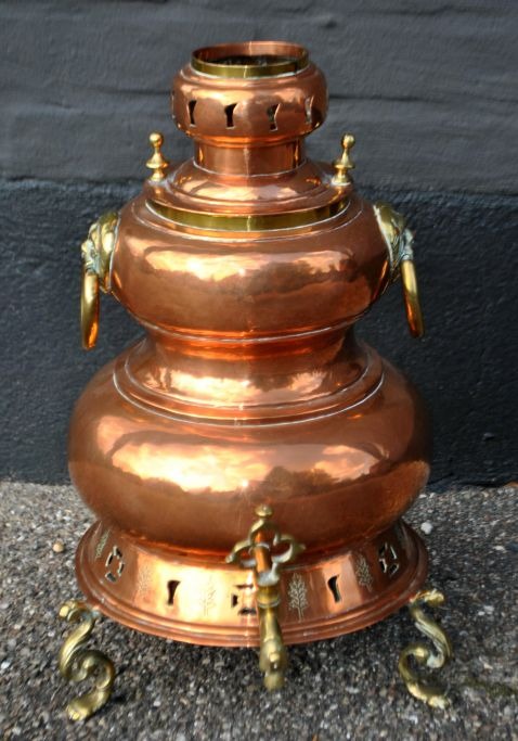 Themaskine i kobber, barok, 18. årh. Danmark. Ben, håndtag og tappehane af messing. Dekoreret med løvehoved og løvefødder. Indvendig fortinnet. H: 41 cm. Dia: 23,5 cm.Emne nummer: 28361