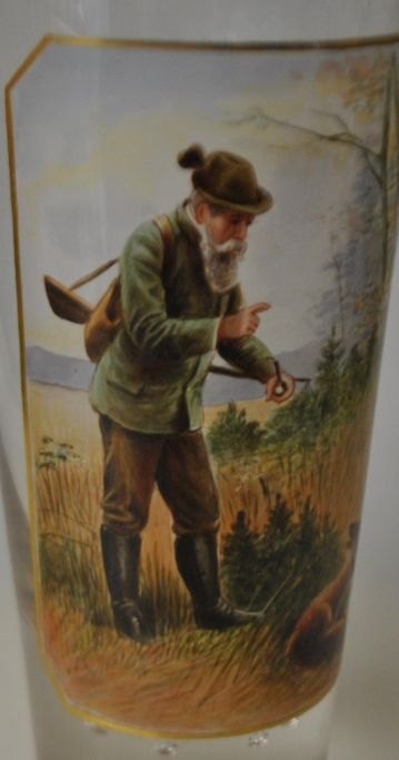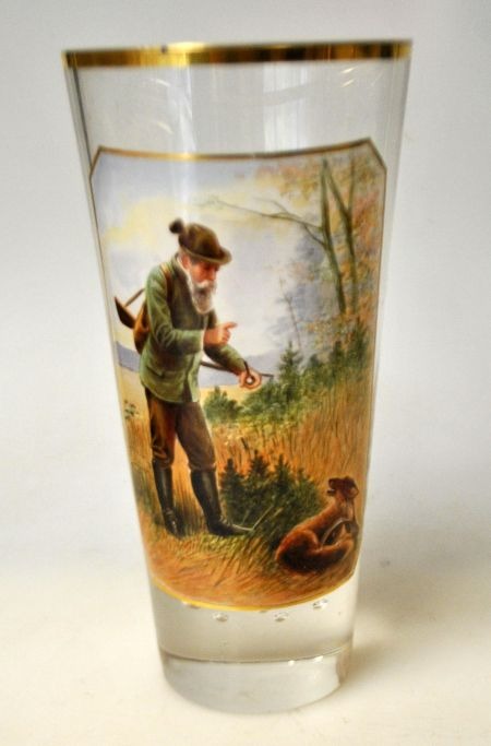 Tysk drikkeglas, 19. årh. Med jægermotiv i overteknik med emalje. Med forgyldninger. H.: 17,5 cm. Indvendig i fod med luftbobler.Flot stand!