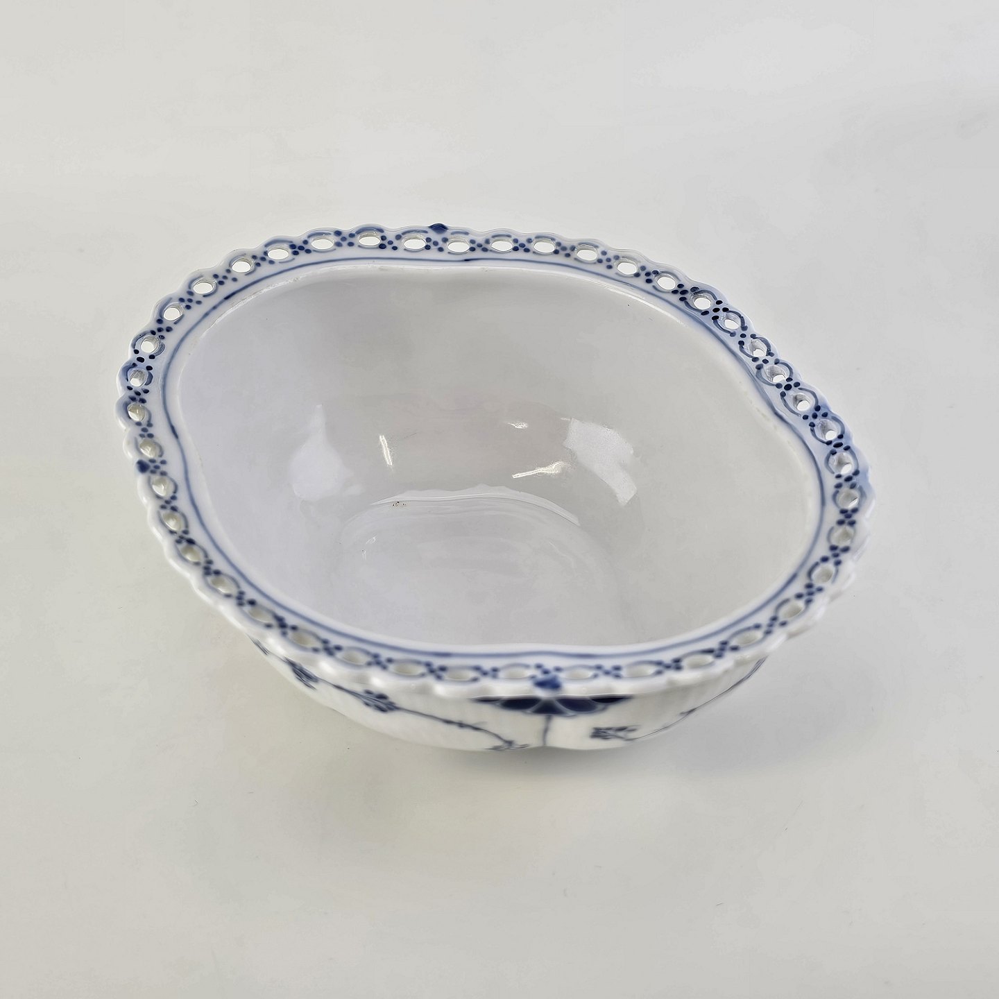 Stellet Musselmalet Helblonde er hvidt porcelæn dekoreret med blå blomster og mønstre. Øverst er porcelænet dekoreret med hulmønster.