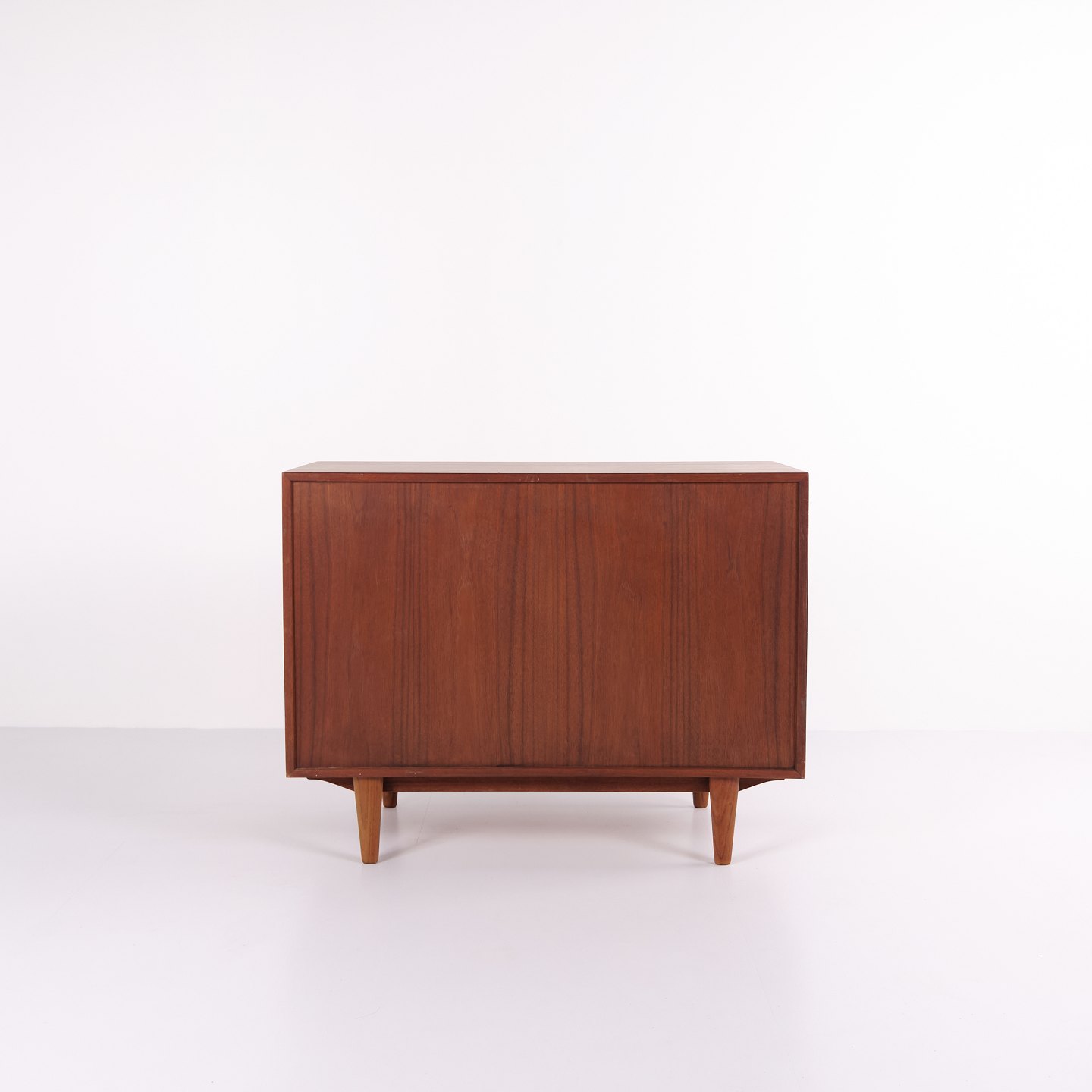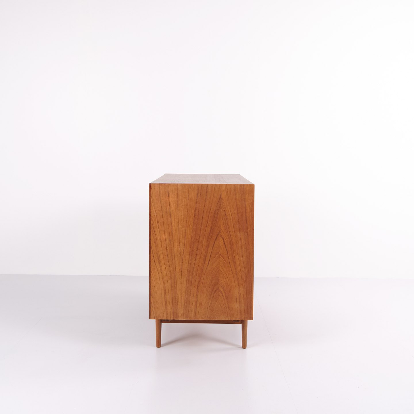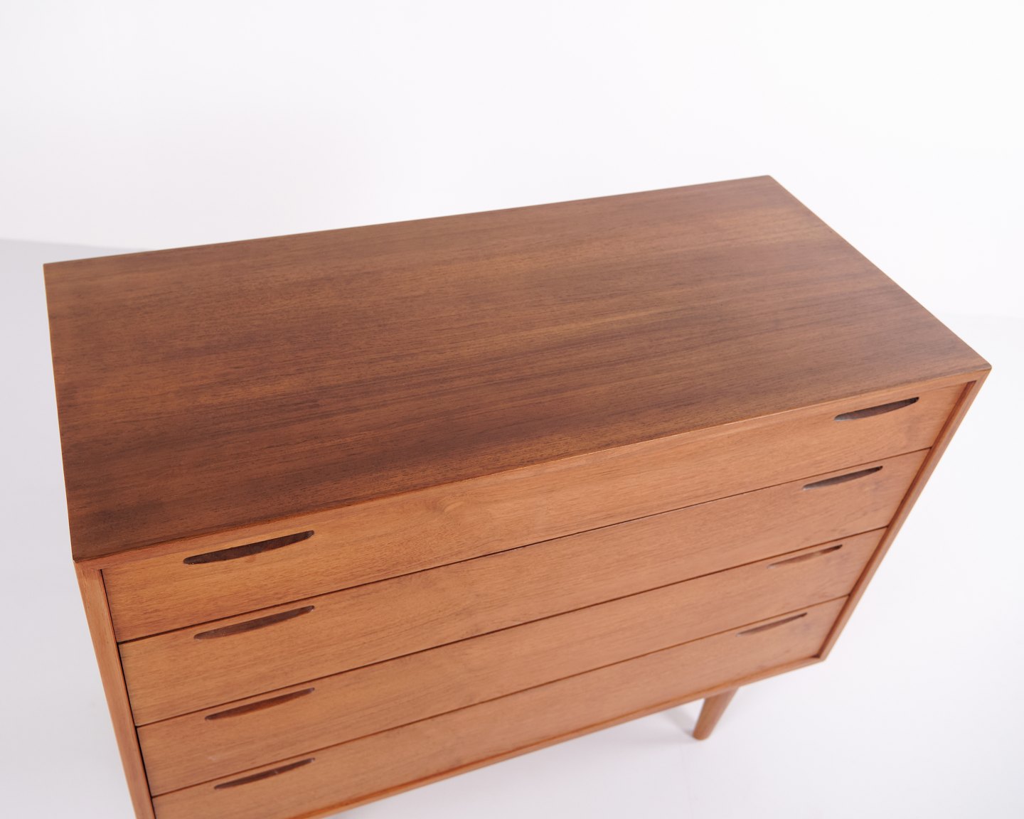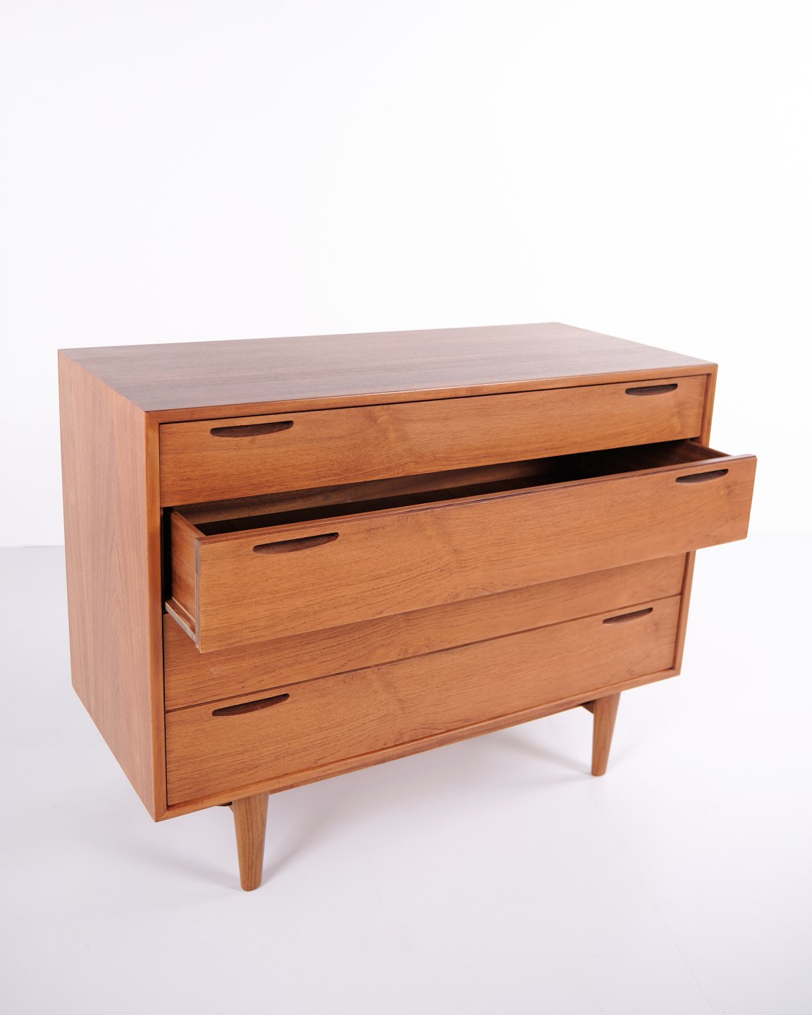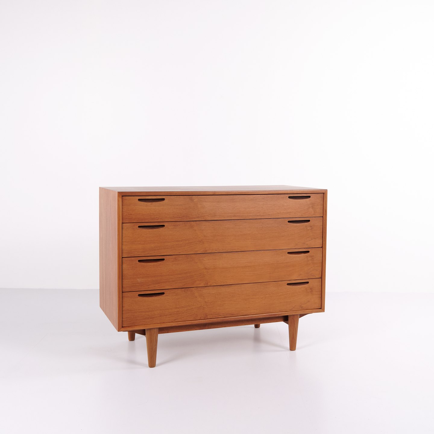 Kommode designet af Ib Kofod-Larsen og fremstillet af Brande Møbelfabrik i 1950’erne. Kommoden er udført i teaktræ med fire rummelige skuffer og karakteristiske, enkle greb, som understreger Kofod-Larsens rene og funktionelle formsprog.— Oprindelse: Danmark