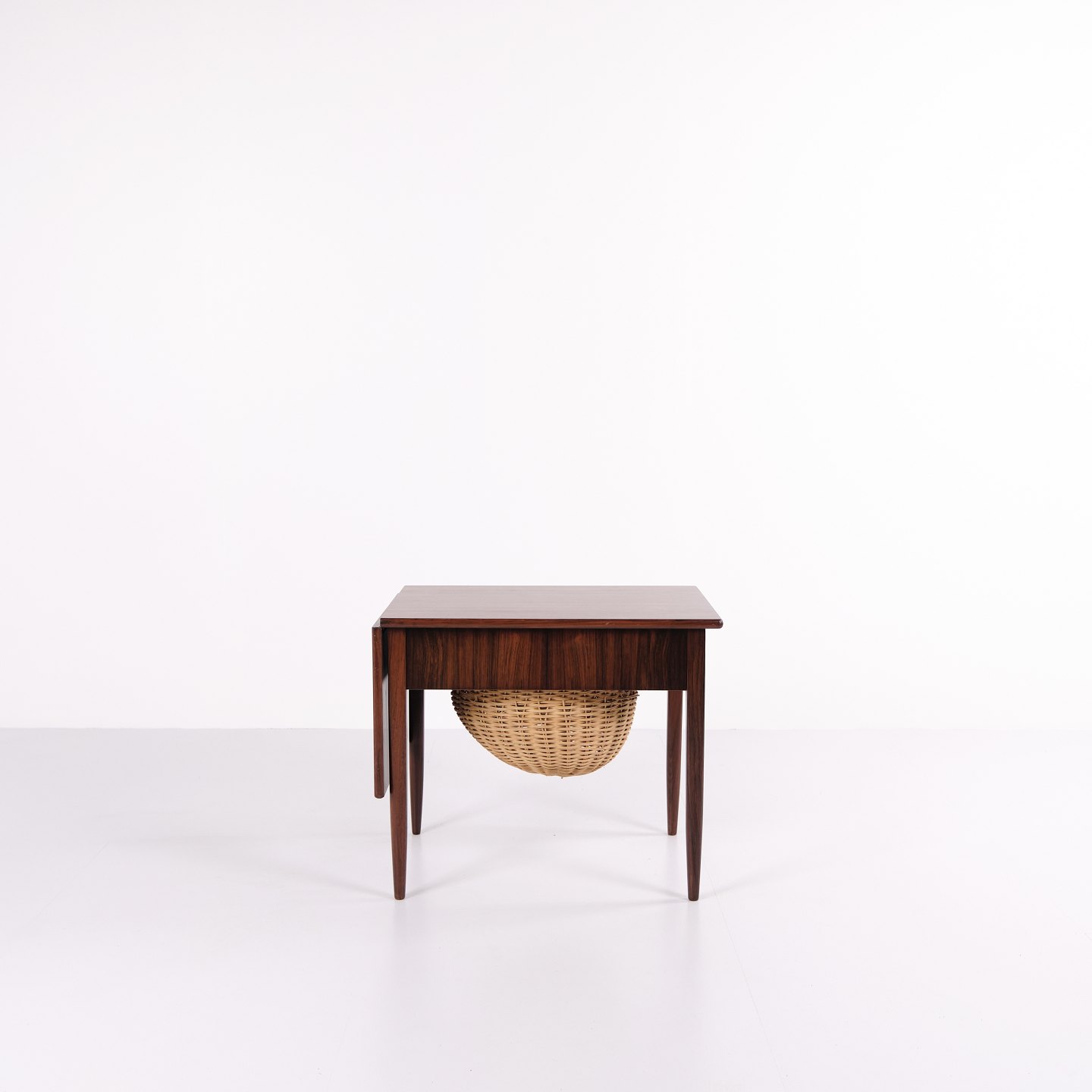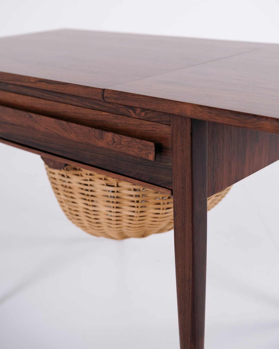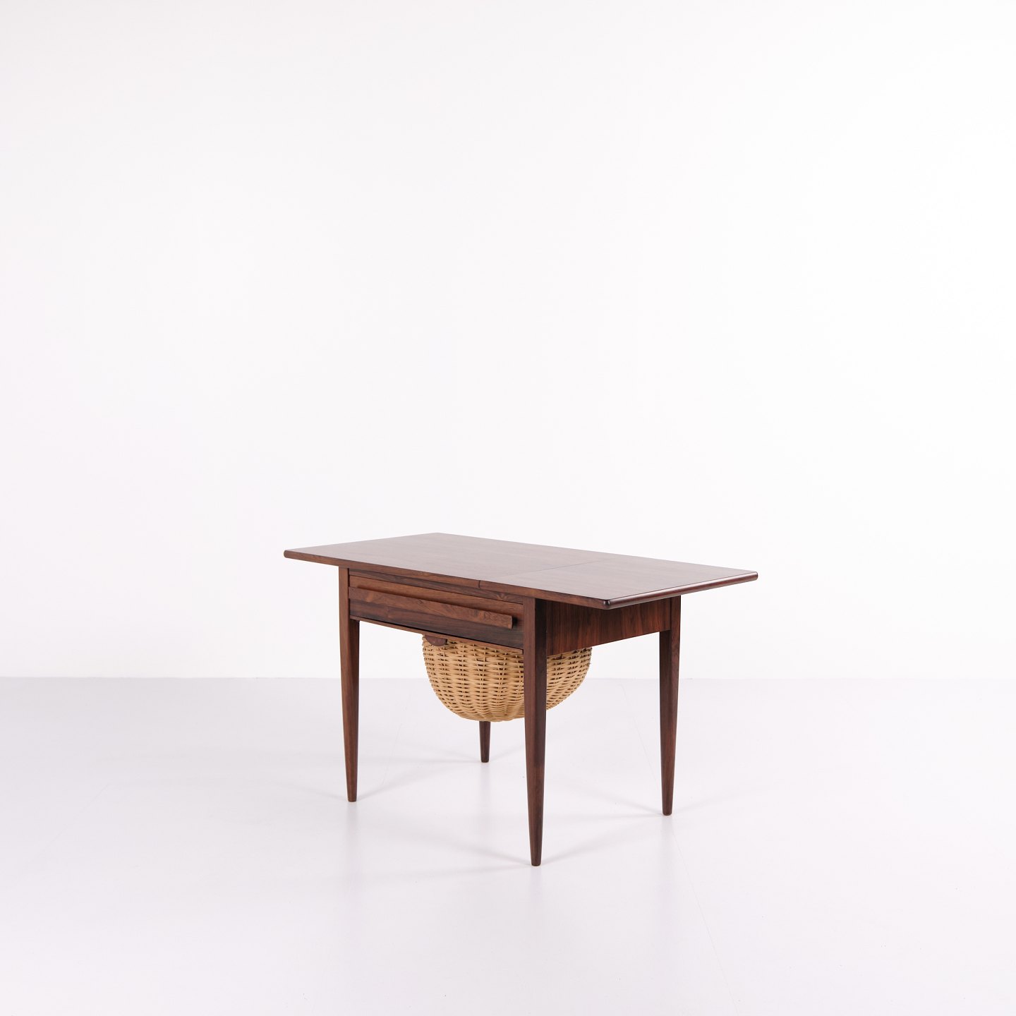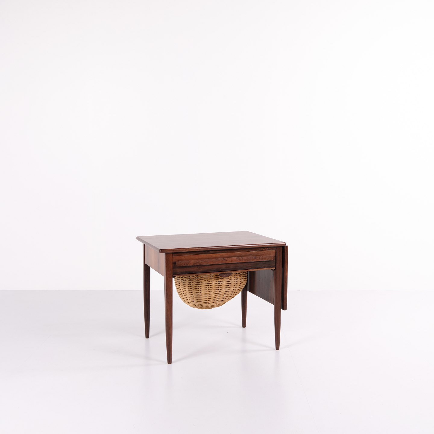 Foldbart sybord designet af Johannes Andersen og fremstillet af Silkeborg Møbelfabrik i 1960’erne. Bordet er udført i palisander og har både skuffe og udklappelig bordplade, hvilket gør det særligt funktionelt til opbevaring og arbejde.— Oprindelse: Danmark