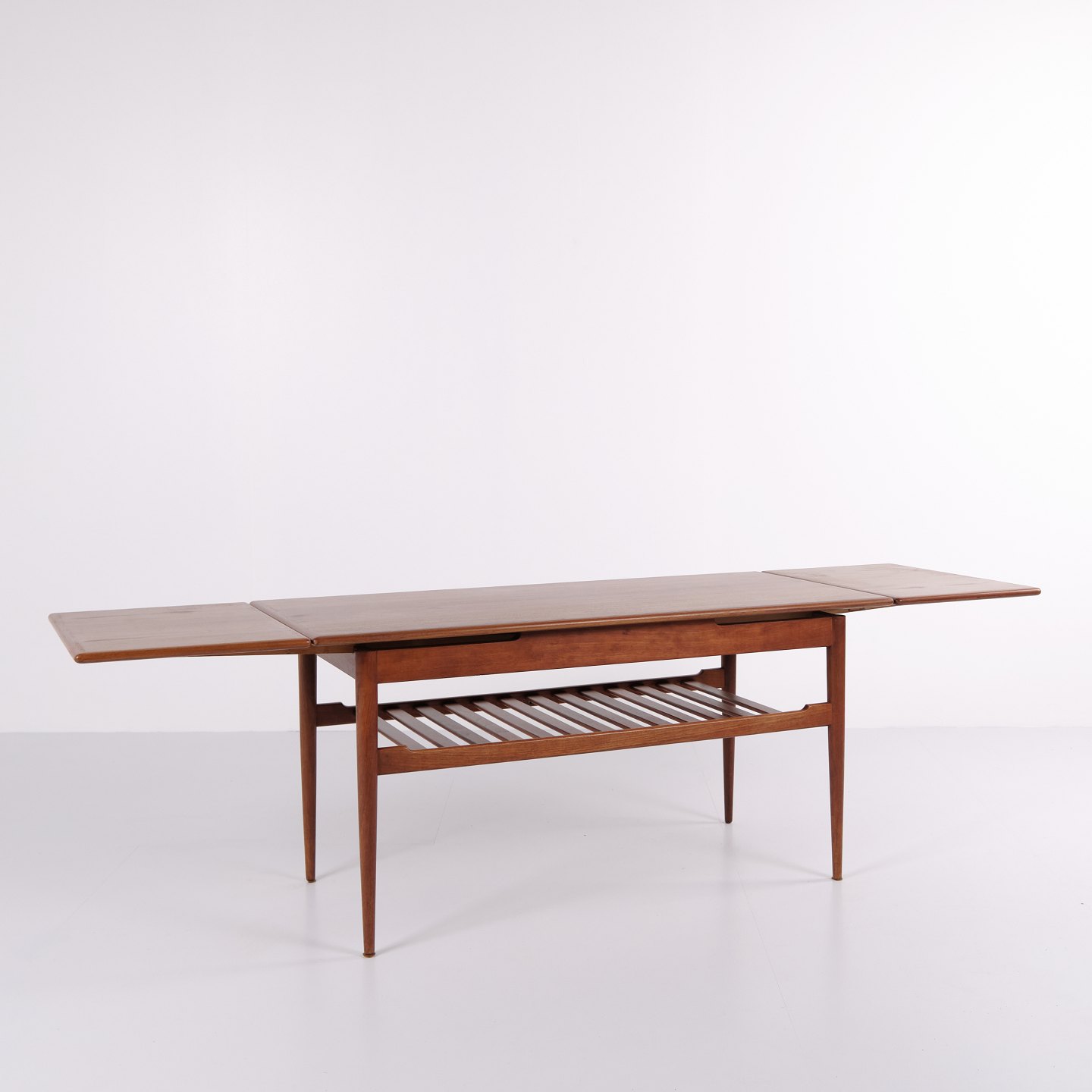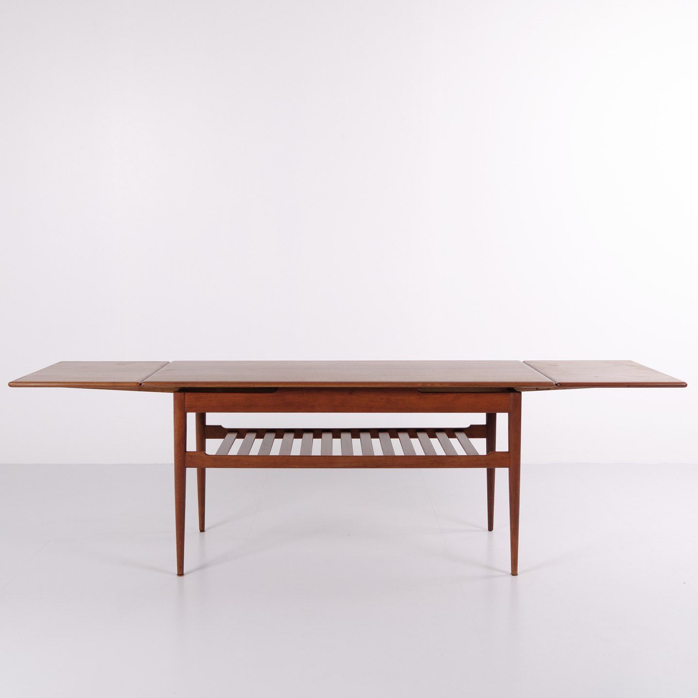 Sofabord fra 1960’erne, udført i teaktræ med praktisk hylde og udtræk, der giver ekstra bordplads efter behov.— Oprindelse: Danmark