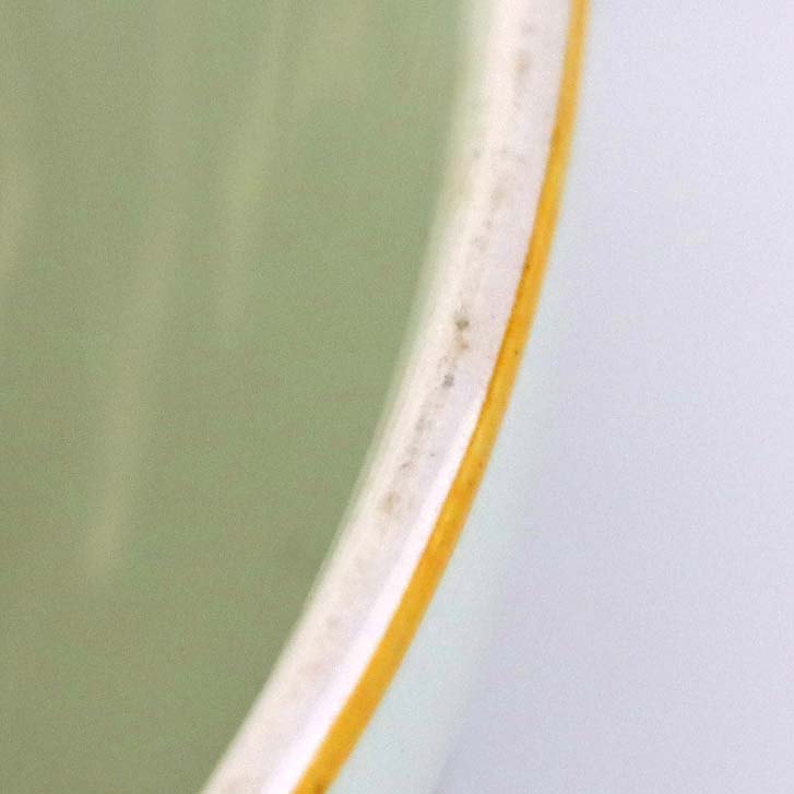 Fremstår med mindre ridse i glasuren, ujævnhed i glasuren på indersiden samt brugsspor på topkanten.